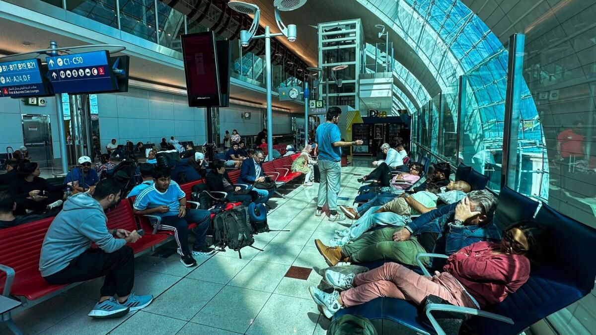 9.59: dxb’deki sahnelerAFP, Dubai Uluslararası Havalimanı’ndaki (DXB) yolcuların durumunu kontrol ediyor.Bir bağlantı masasında uzun kuyruklar görüldü: