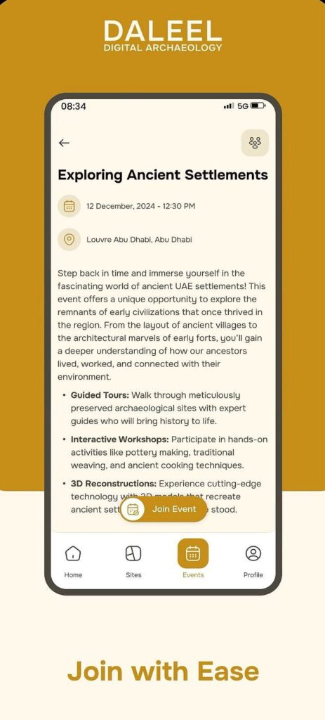 Ek olarak, Daleel, turistlerin ve sakinlerin onları kolayca bulup keşfetmelerine yardımcı olmak için zamanlamalar, konumlar ve entegre Google Haritalar’la birlikte BAE genelinde arkeolojiyle ilgili etkinliklerden oluşan bir takvim oluşturur.