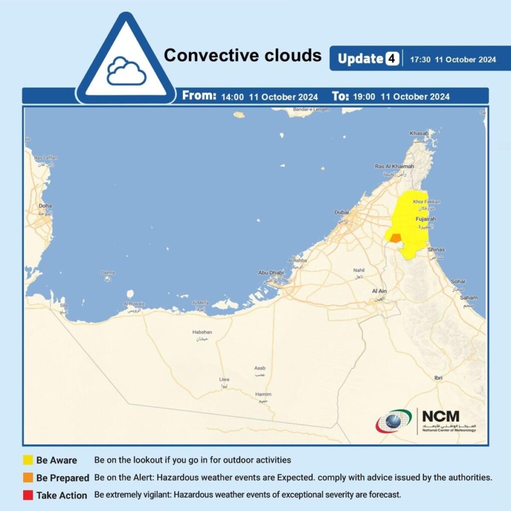 Ülkenin bazı bölgelerinde ikinci gün şiddetli yağışlar yağarken vadiler taştı ve dağlardan aşağı inen şelaleler görülebilir.Ulusal Meteoroloji Merkezi, 11 Ekim Cuma günü bir uyarı yayınlayarak, sakinleri bu hava koşullarında dikkatli olmaya ve sel baskınlarına eğilimli alanlardan uzak durmaya çağırdı.Kurum ayrıca ülkenin doğusundaki bazı bölgeler için sarı alarm verdi – çoğunlukla Fujairah. Aşağıdaki haritaya bir göz atın: