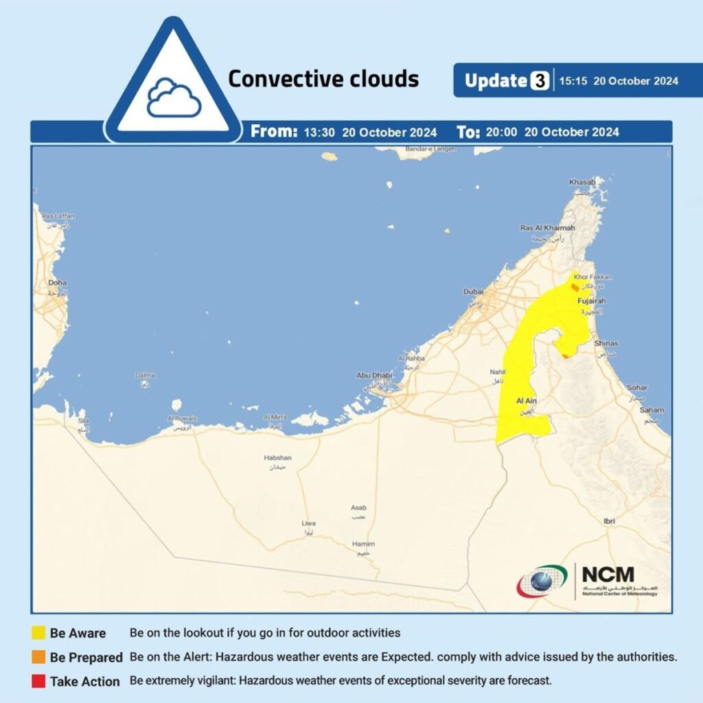 20 Ekim Pazar günü BAE’nin bir kısmına hafif yağmurlar yağdı. Storm Centre tarafından yayınlanan videolar, ülkenin doğu ve kuzey bölgelerine giden bölgelerdeki yağmurları gösteriyor.Günün erken saatlerinde meteoroloji dairesi, sakinlerin doğu ve güney bölgelerinde konvektif bulut oluşumu olasılığı olan adil ila parçalı bulutlu bir gün bekleyebileceklerini söyledi.Met, bugün saat 8’e kadar süren yağışlarla ilişkili konvektif bulut oluşumu için turuncu bir uyarı yayınladı.