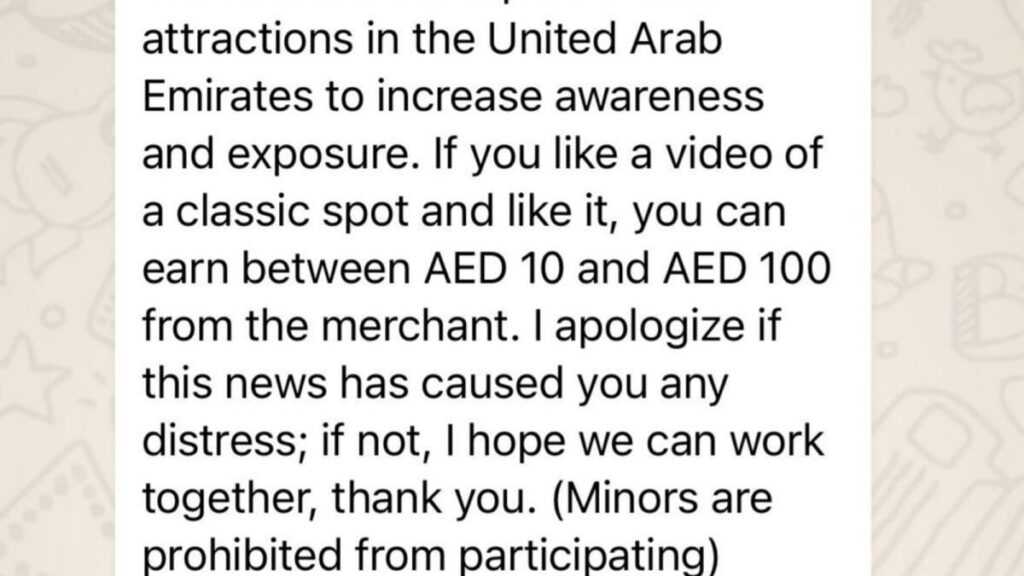 Gruplardan birine, meşru görünmesi için gerçek bir pazarlama şirketinin logosunu kullanan bir Khaleej Times muhabiri eklendi. KT muhabiri aslında aynı gün iki benzer gruba eklendi ve dolandırıcıların insanları işe alma oyunlarını agresif bir şekilde artırdığını kanıtladı.Yine geçen ay, Khaleej Times, fazladan para kazanmak yerine kurbanlardan biri olan Dubaili bir otelcinin yaklaşık 66.000 Dh’lik tüm hayat birikimini kaybettiği yarı zamanlı bir iş dolandırıcılığını ortaya çıkardı.