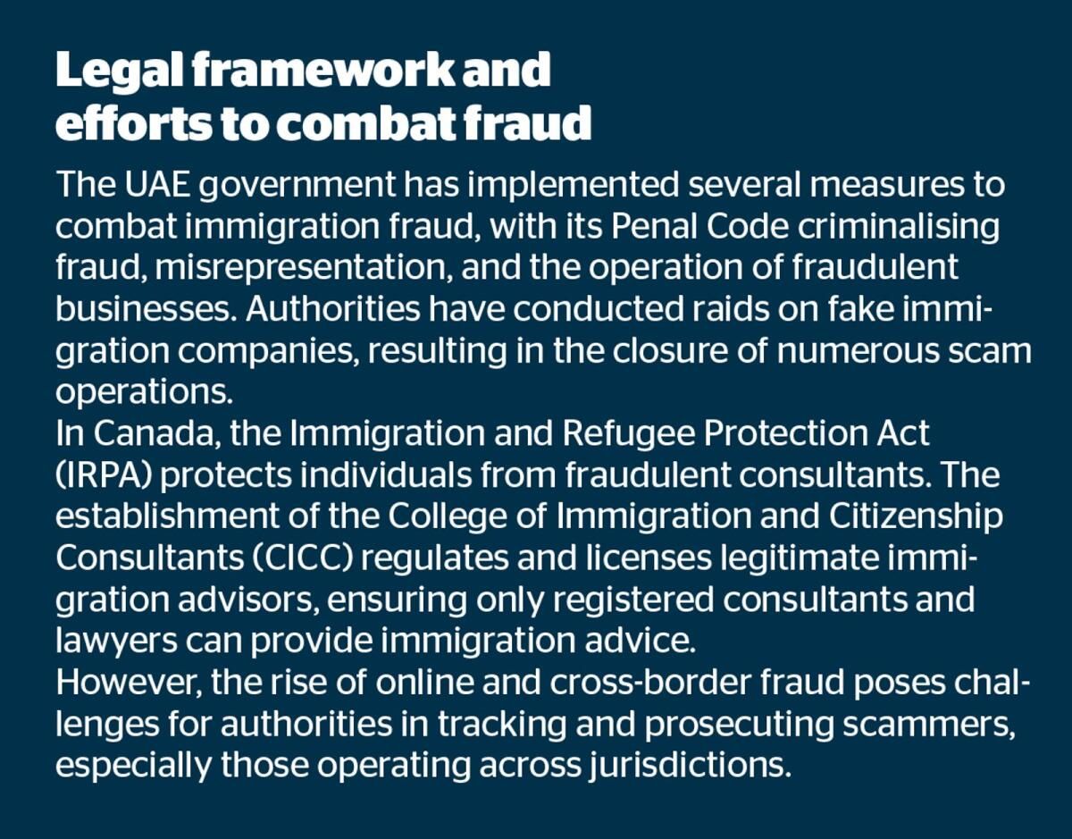 Yetkililer bu planları ortaya çıkardıklarında, başvuru sahiplerinin yalnızca vizeleri reddedilmez, aynı zamanda genellikle ömür boyu yasaklarla karşı karşıya kalırlar. 2021’de bu rotayı izleyen ve isimlendirmek istemeyen bir kadın, “Bana söyleneni yaptım” dedi. Daha sonra yerleşmeyi umduğu ülkeden men edildi.Deneyimli bir avukat ve 1993 yılında kurulan Dubai merkezli bir hukuk firması olan Bayat Group’un kurucusu Sam Bayat, Karama’daki bir göçmenlik danışmanının müşteriler için sahte banka dekontları bastığı bir vakayı paylaştı. “Bu firmaların çoğu, sadece başvuru ücretlerinden kar elde etmek için yetersiz nitelikli başvuru sahiplerini hedefliyor” dedi.Bayat, “Ahlaklarında eksik olan şeyleri tonerle telafi ediyorlar” dedi. “Durum tespiti esastır. Bu tuzaklara düşmenin yıkıcı sonuçları olabilir “diye uyardı.“Bireylerin göç sürecine dikkatli yaklaşmaları çok önemlidir. Meşru göç yolları var, ancak uygun şekilde akredite edilmiş kaynaklardan dikkatli navigasyon ve profesyonel rehberlik gerektiriyorlar “dedi.Daha da endişe verici olan, göçmenlik şirketlerinin iz bırakmadan ortadan kaybolduğu, müvekkillerine yasal başvuru ve önemli mali kayıplar bırakmadığı durumlardır. Dubai merkezli bir danışmanlık şirketi olan HZ Legal’den Hossam Zakaria, savunmasız bireylerden yararlanan dolandırıcı vakalarıyla dolup taştığını söylüyor. “Kanada, Ekspres Giriş Sistemi ve İl Aday Programları (PNP) gibi çekici göçmenlik programlarıyla önemli bir hedef haline geldi.”