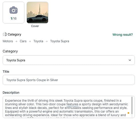 Şimdi, Shozon ve hatta diğer platformlardaki benzer listeleri göz önünde bulundurarak kullanılmış arabanız için uygun bir fiyat belirlemelisiniz. İyi haber şu ki, Shozon’un AI aracı, en yüksek satış şansına sahip bir fiyatı hızlı bir şekilde belirlemenize yardımcı olacak.