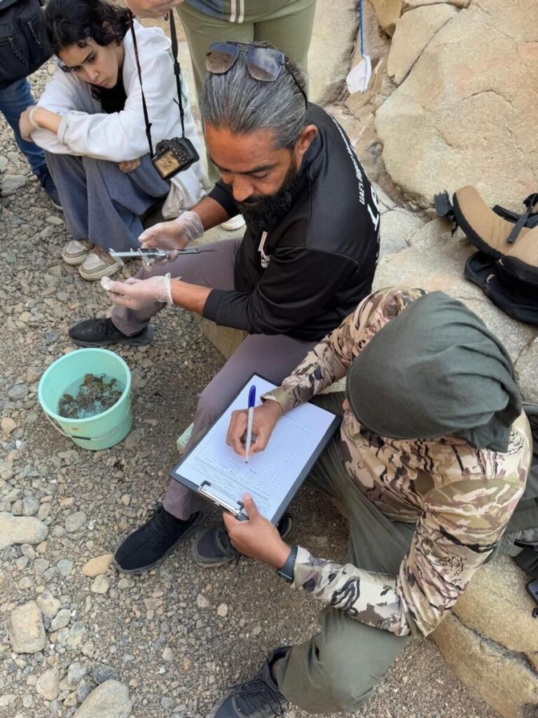 Arap TahririGönüllüler, vadide yaklaşık 2,5 kilometre yürüdükten sonra, onları ölçmek ve serbest bırakmak için kurbağa topladıkları bir havuza ulaştılar. Emirates Nature-WWF kıdemli sosyal yardım görevlisi Ahmad Abu Samra, ”Kurbağalar ve yusufçuklar bir su kaynağının tazeliğinin çok iyi göstergeleridir” dedi. “Kirlilik ve su sıcaklıklarındaki ani değişikliklere duyarlılar. Bölgeyle ilgili verilere sahip olmak için bu bilgileri her ay topluyoruz.”