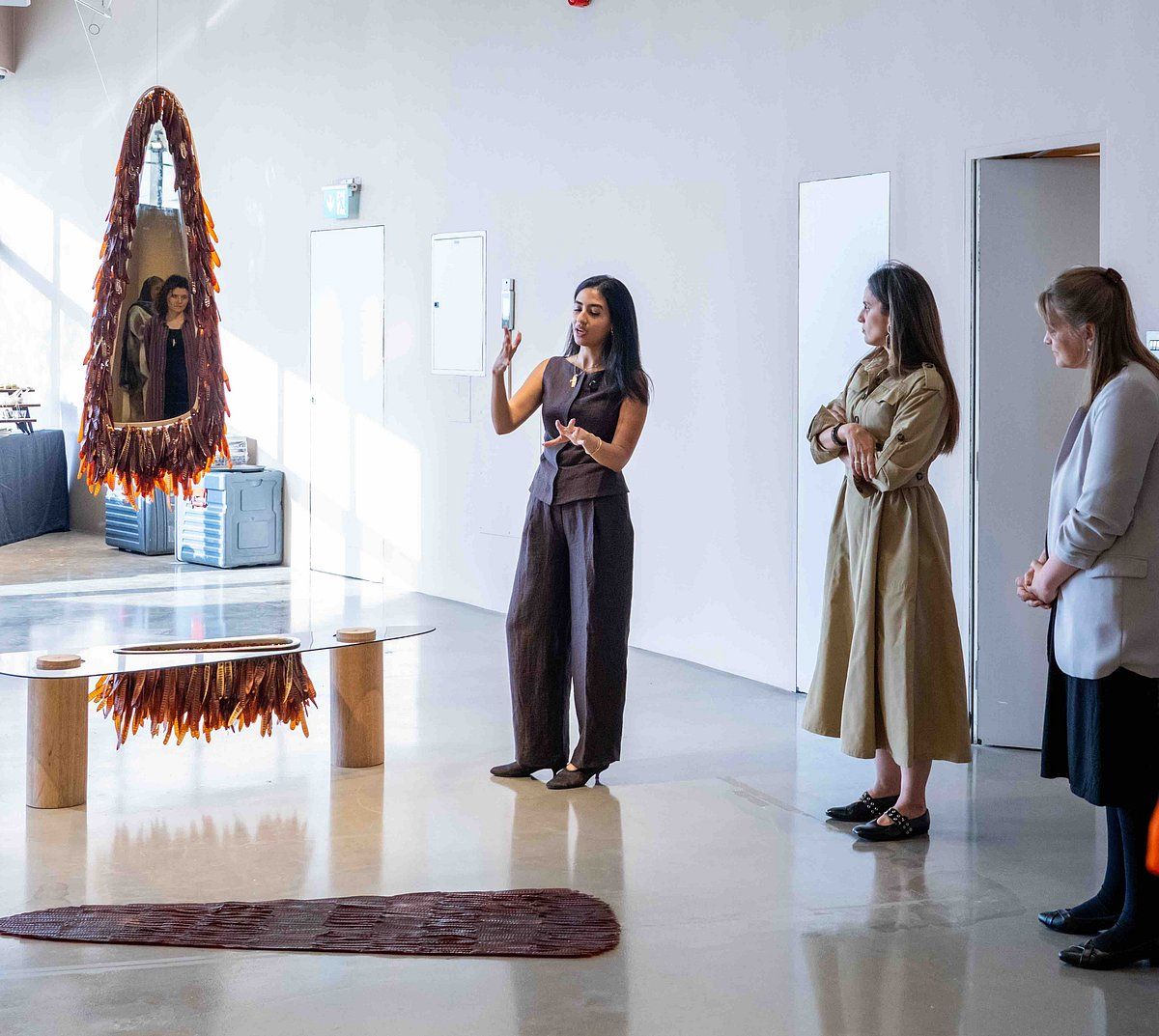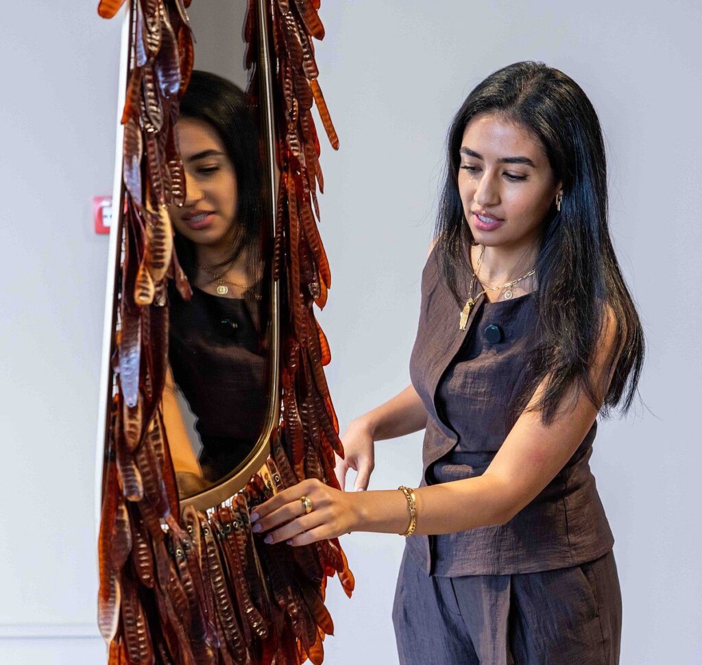 Serginin içinde ziyaretçiler duyusal bir yolculuğa davet ediliyor: yansıtıcı yüzeyler yerini yumuşak dokulara ve karmaşık doğramalara bırakıyor. Merkezi bir dolap, yarı heykel ve yarı hikaye olan “Sara’ir” enstalasyonu demirliyor. “Alt kısım BAE’Yİ temsil ediyor – pirinç pimler, Mando işçiliği – üst kısım ise Mısır’a oyma motifler ve sembolik işaretlerle atıfta bulunuyor” dedi. Ceylan şeklindeki bacaklar bile kasıtlı, “Uyumu, güzelliği ve gücü temsil ediyorlar… hem Emirlik hem de Mısır kültürlerinde semboliktir.”