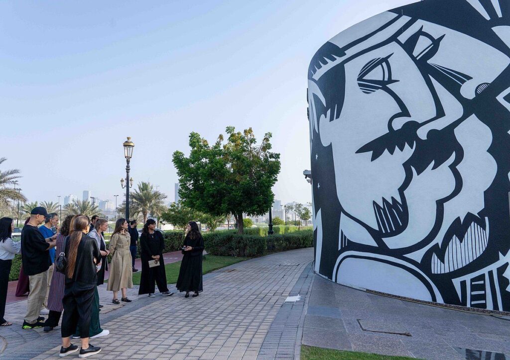 Bu arada, Flag Island Amfitiyatrosu’ndaki suyun karşısında Kanadalı sanatçı Fathima Mohiuddin, farklı bir tür haraç çiziyor – bu, sade siyah beyaz işlenmiş bir kamu duvarına yayılıyor. Duvar resmi Ahazeej, Emirliklerin ritmik geleneklerine bir aşk mektubudur: danslar, mısralar, nesiller boyunca yankılanan ateş yakan okunuşlar. “Bu kadar çok farklı şiir türü olduğunu bilmiyordum,” dedi ve ekledi, “Ateşlerin etrafında okunan şiir, çağrı ve yanıt olarak şiir, uyum içinde söylenen şiir…”