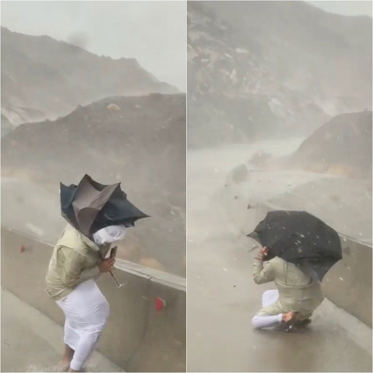 Fırtına Merkezinin Cumartesi günü paylaştığı bir video, Umman’daki Katnah Al Fayyad yolunun üzerine yağan şiddetli yağmuru yakaladı. Görüntülerde, fırtına avcısı Fahad Mohamad Abdul Rehman fırtınaya göğüs gererken, şiddetli rüzgarlar şemsiyesini ters çevirmekle tehdit ederken yolda çömelirken görülüyor.