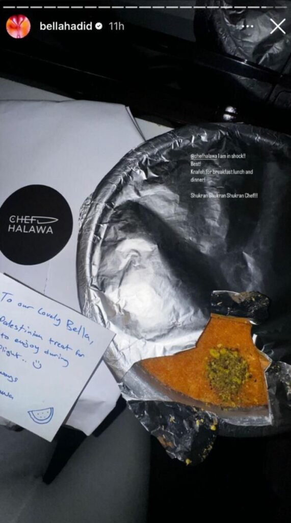 Şehir, Chopard’ın Dubai Alışveriş Merkezi’ndeki en son butiğinin açılışını yapmak için bu hafta şehirdeki süper model Bella Hadid ile uğultu yapıyor. Chopard’ın kreatif direktörü Caroline Scheufele’nin de katıldığı Hadid, butiği resmi olarak açmak için sürpriz bir görünüme kavuştu. Hayranlar, küresel süperstarı şahsen gördükleri için heyecanlarını kontrol altına alamadılar.Gerçek Dubai tarzında Hadid, kalbini çalan özel bir muamele ile şehrin bazı mutfak lezzetlerinin tadını çıkarmayı da başardı: kunafa. Dubai’de geleneksel tatlıyı benimseyen Filistinli bir mutfak sanatçısı olan şef Ahmad Halawa’dan başkası tarafından yapılmayan fıstıklı bir kunafa ile tedavi edildi.Arapça tatlı ikram, iç açıcı bir notla geldi: “Sevgili Bella’mıza, uçuşunuz sırasında tadını çıkarmanız gereken Filistinli bir ikram.”Hadid İnstagram hikayelerine gelince övgülerini geri tutmadı. “@chefhalawa Şoktayım!! En iyisi! Kahvaltı öğle ve akşam yemeği için Knafeh! Shukran Shukran Shukran Şefi!!!” filistin-Amerikan modelini paylaştı.
