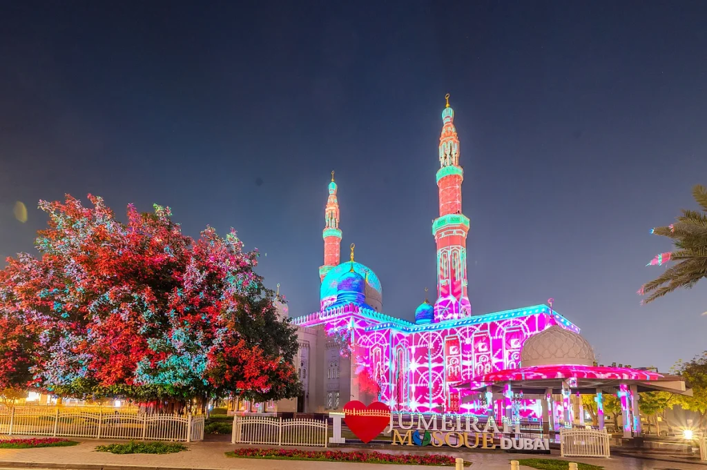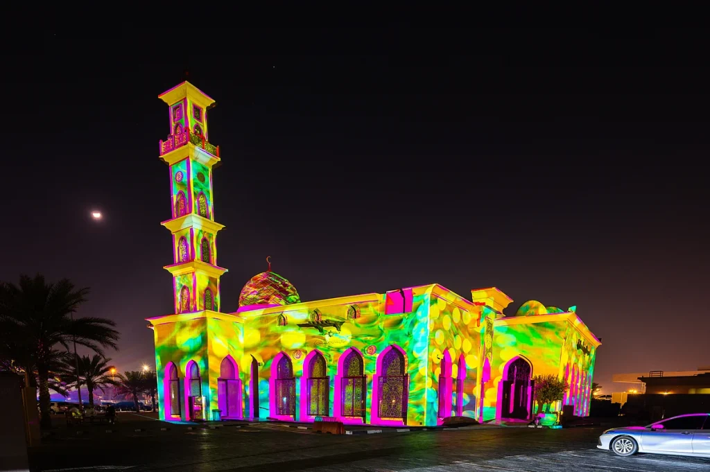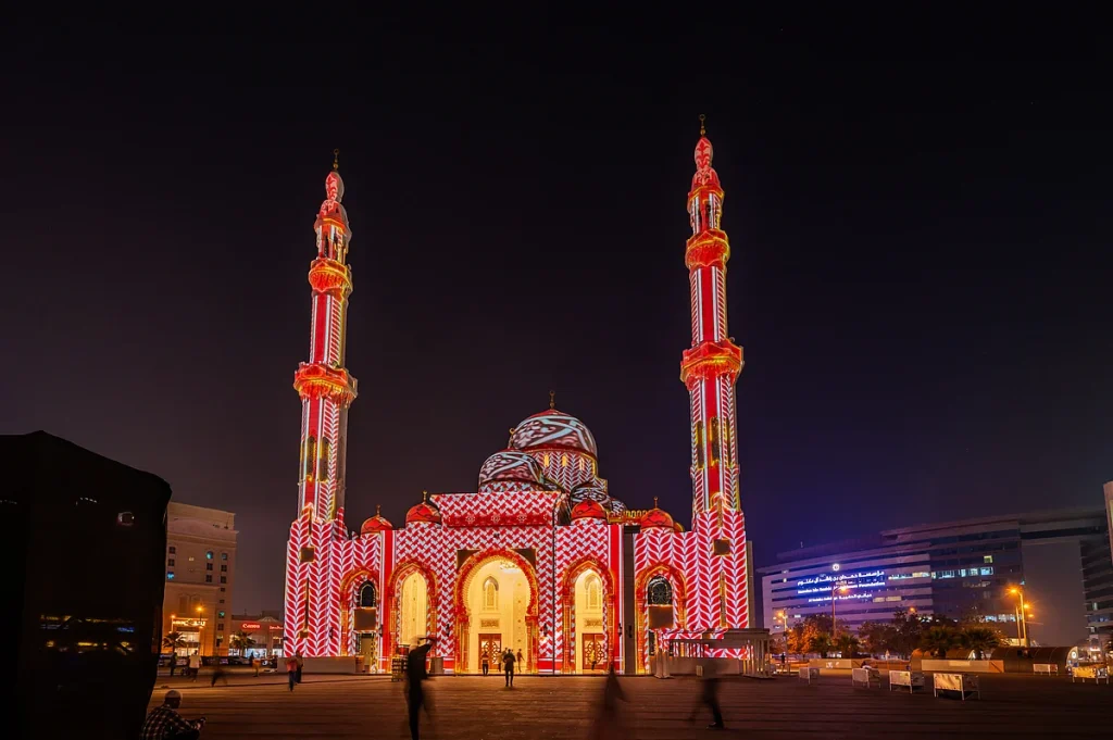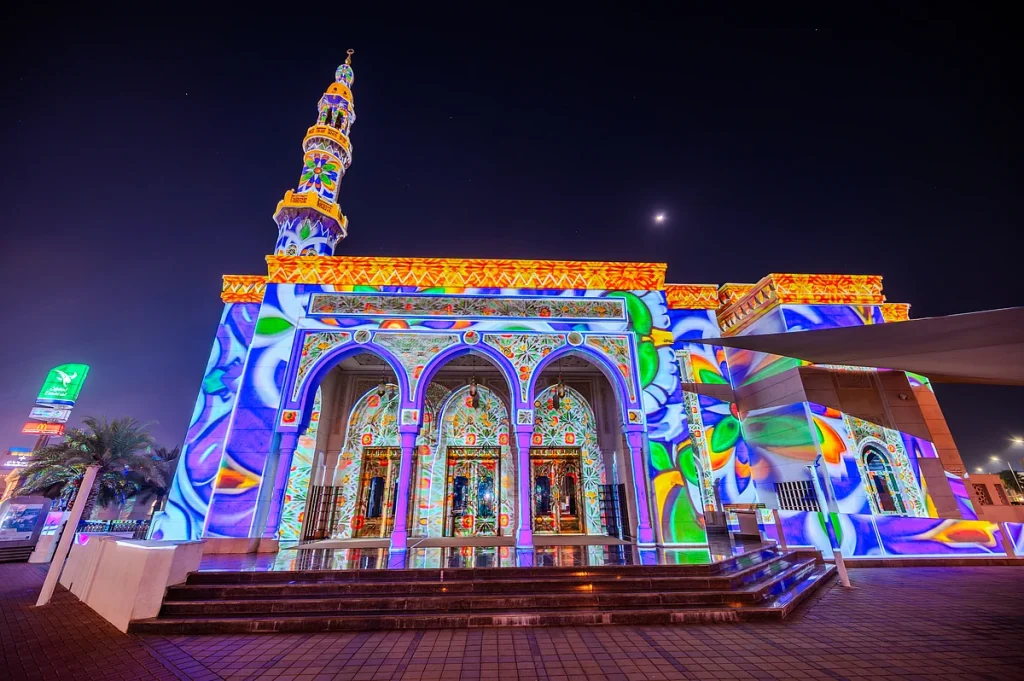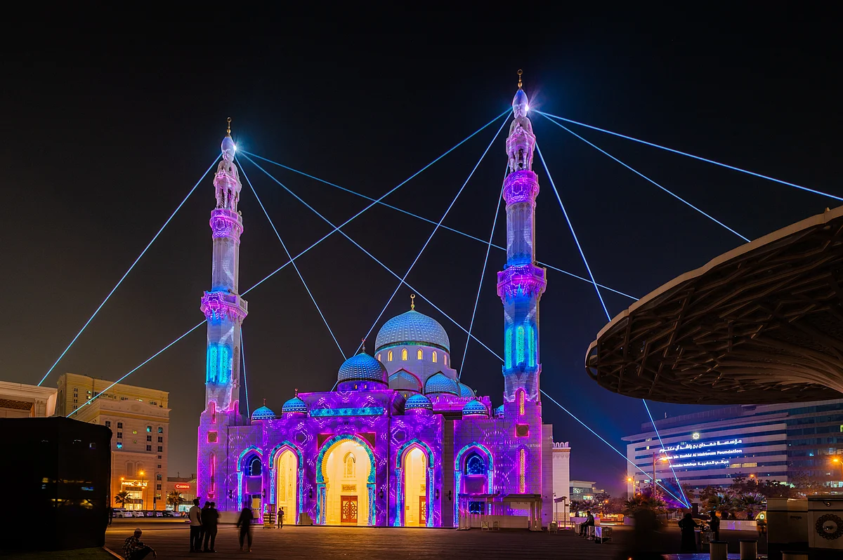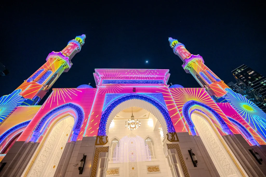 İftardan sonra aileler yürüyüşe çıktıkça ve ibadetçiler camiler arasında hareket ettikçe Dubai’nin bazı bölgeleri bu Ramazan aydınlanıyor. Camiler, Al Seef ve Dubai Festival City Alışveriş Merkezi’nin karşısındaki projeksiyon enstalasyonları, cepheleri islami desenleri, kaligrafiyi ve rengi harmanlayan yumuşak ışıklı vitrinlere dönüştürüyor.