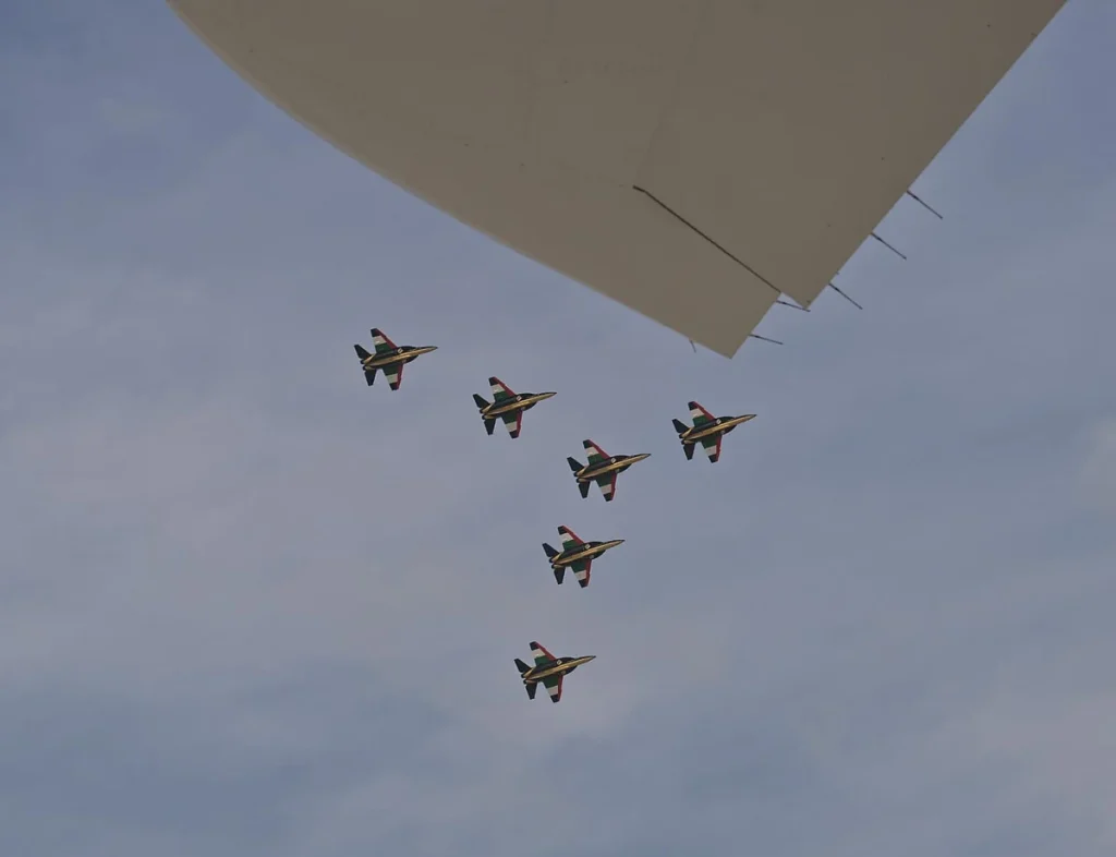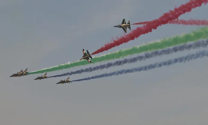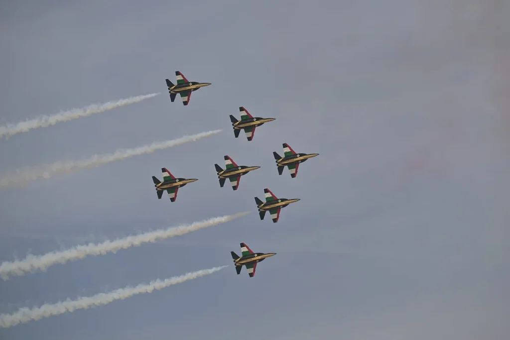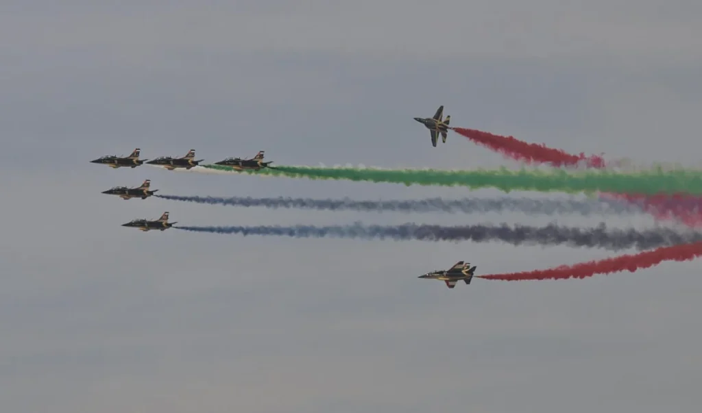 BAE çölünü temsil eden altın vurgular ve ülkenin petrol mirasını yansıtan siyah detaylar taşıyan uçakları, sürekli alkış alan bir dizi koordineli geçiş gerçekleştirdi.