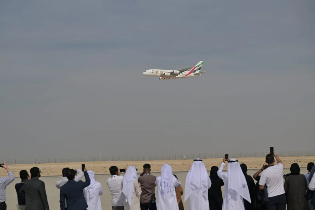 Emirates A380, Dubai Airshow üzerinden alçak bir geçiş yaparken pist boyunca toplanan kalabalıklar. Telefonlar, uçak çöl fonunda süzülürken izleme hattından kalktı ve öğleden sonraki en büyük tepkilerden birini çekti.
