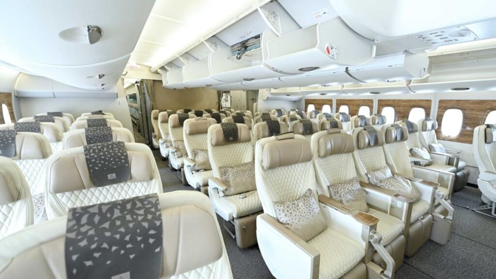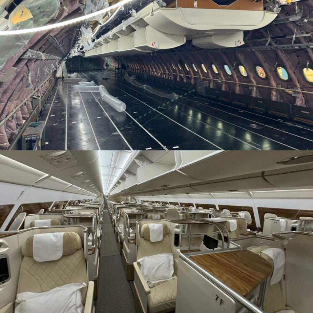 Uçağın içindeki çalışma tamamlandıktan sonra, Business ve Economy Sınıfı koltuklar yeniden boyanır, yeniden kesilir ve yeni kılıflar ve yastıklama ile yeniden döşenir. Birinci Sınıf süitlerde deri, kol dayamaları ve diğer malzemeler de değiştirilir.