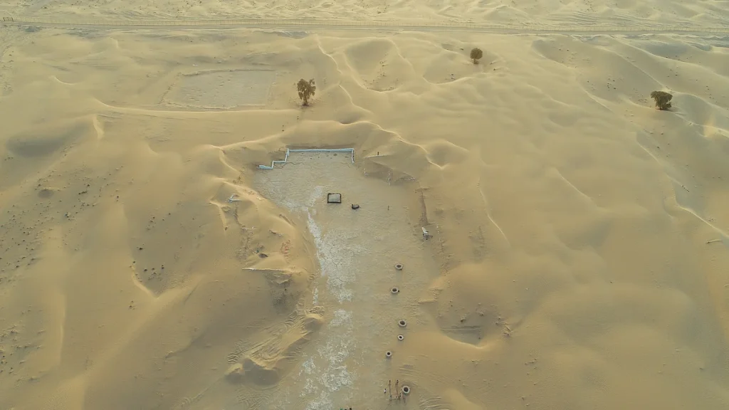 Şehirden yaklaşık 95 km uzaklıkta bulunan Saruk El Hadid, Dubai Hükümdarı Şeyh Muhammed bin Rashid El Maktum’un bir uçuş sırasında kum tepelerinde koyu lekeler fark etmesinin ardından 2002 yılında tanımlandı. Yamaların daha sonra eski eritme işleminden kaynaklanan metalurjik cüruf olduğu doğrulandı.