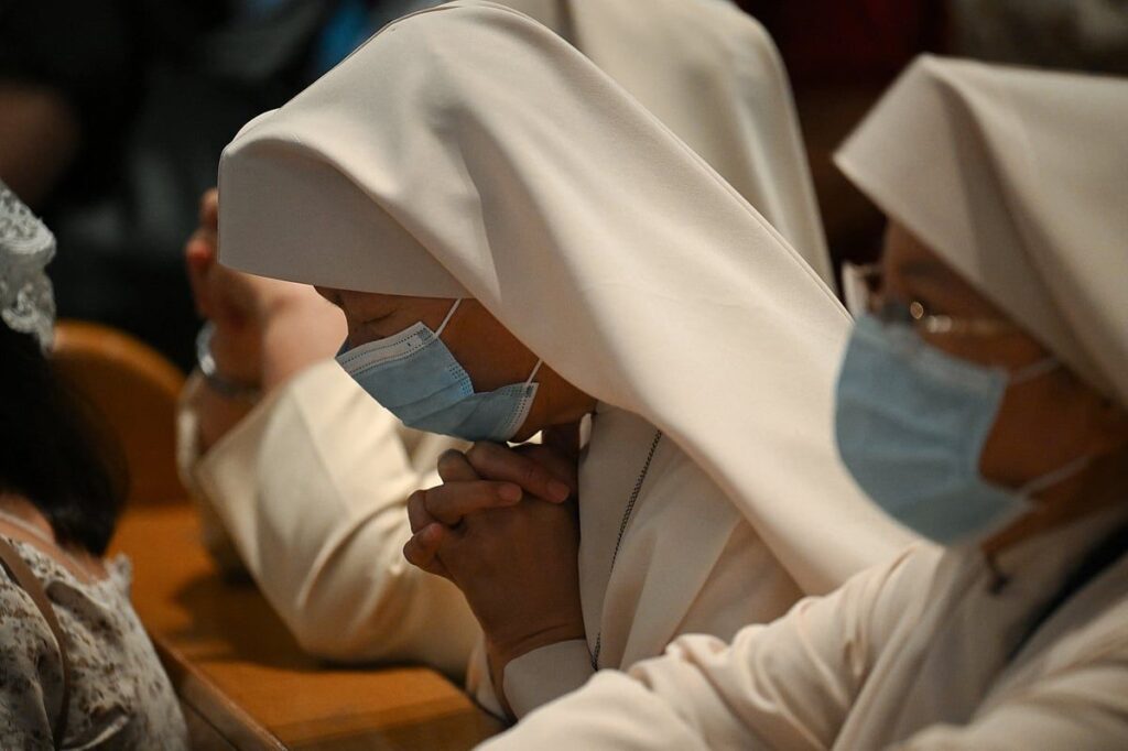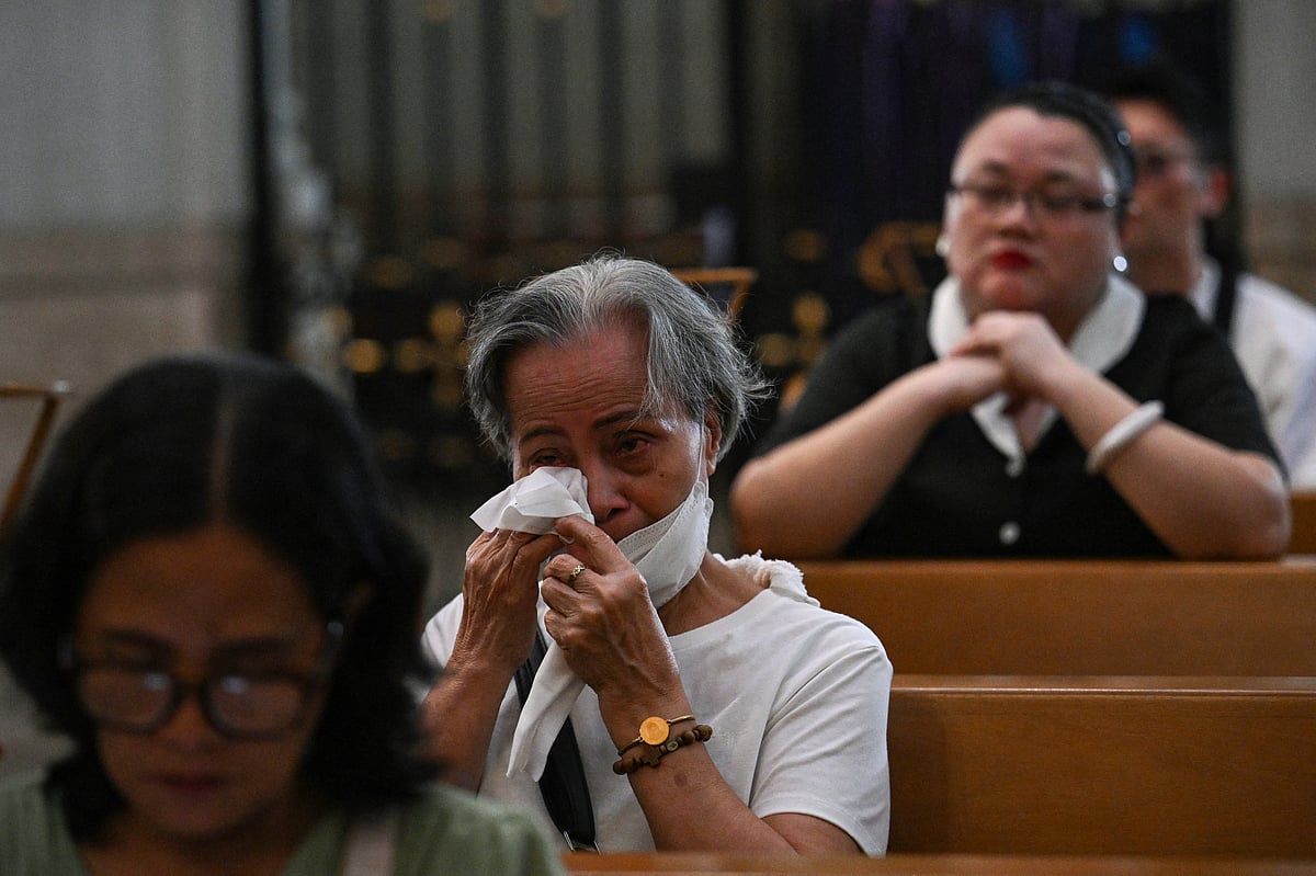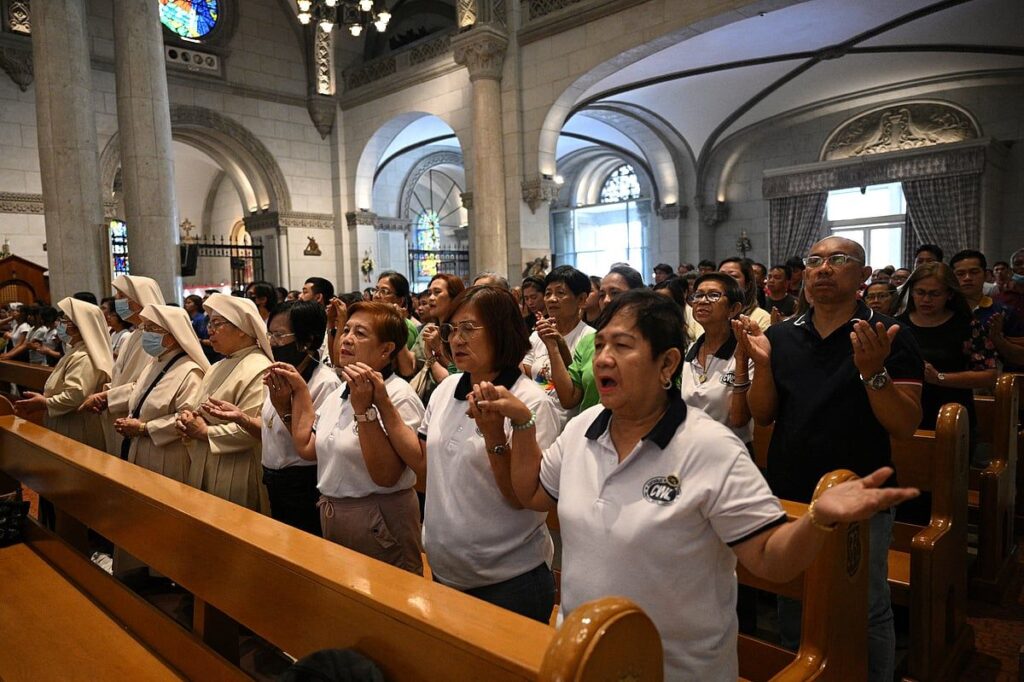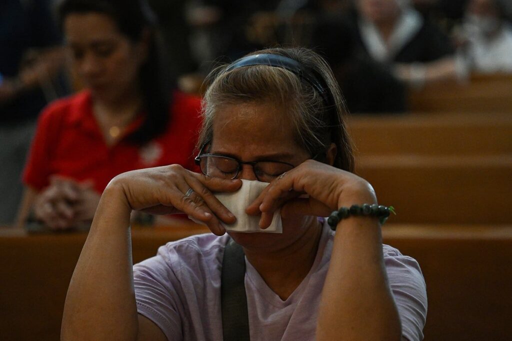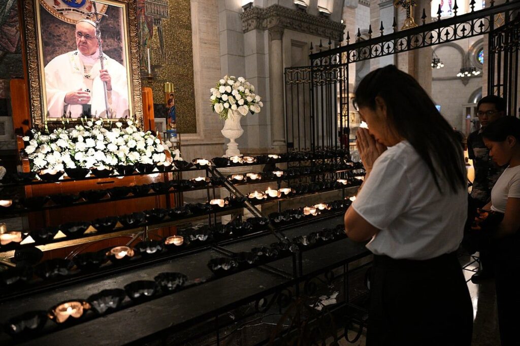 Filipinliler, ölümünden sonra ciddi bir Kitle için Salı günü Manila Katedrali’nin içinde çiçeklerle ve mumlarla çevrili Papa Francis’in çerçeveli bir fotoğrafının önünde diz çöktüler.
