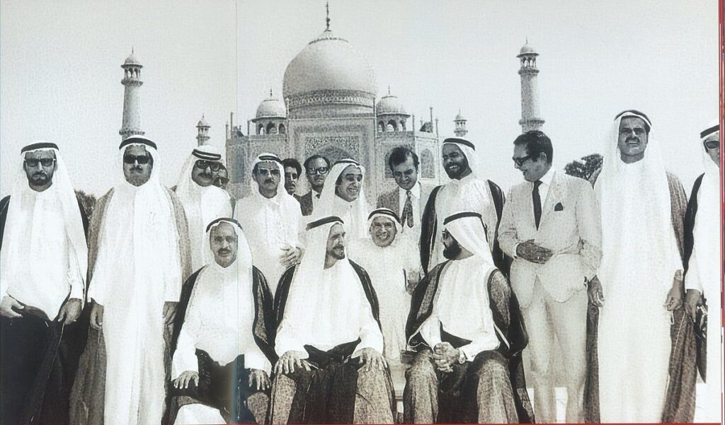 Bu ziyaret sırasında Şeyh Raşid ve heyeti Agra’ya bir gezi yaptı ve ikonik türbe olan Tac Mahal’i gördü. Aşağıdaki resimde, BAE Başkan Yardımcısı ve Başbakanı ve Dubai Hükümdarı olan daha genç bir Şeyh Muhammed bin Rashid Al Maktoum, Şeyh Rashid’in yanında otururken samimi bir şekilde gülümseyip geriye bakarken görülebilir.