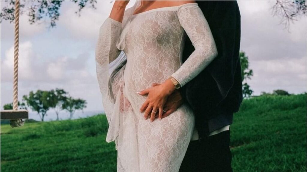 Fotoğraf: Instagram/Hailey BieberHamileliği açıkladıkları Mayıs ayındaki yemin yenileme videolarında Hailey’nin uzun, dantelli beyaz bir elbise ve peçe giydiği görülebilir. Ayrıca kendisi ve Justin’in bir tarlada durduğu birkaç görüntü sağladı. Justin onun arkasında durdu, kollarını karnına doladı ve eşleşen alyanslarını sergiledi. Başlığını basit tuttu, sadece kocasını etiketledi.