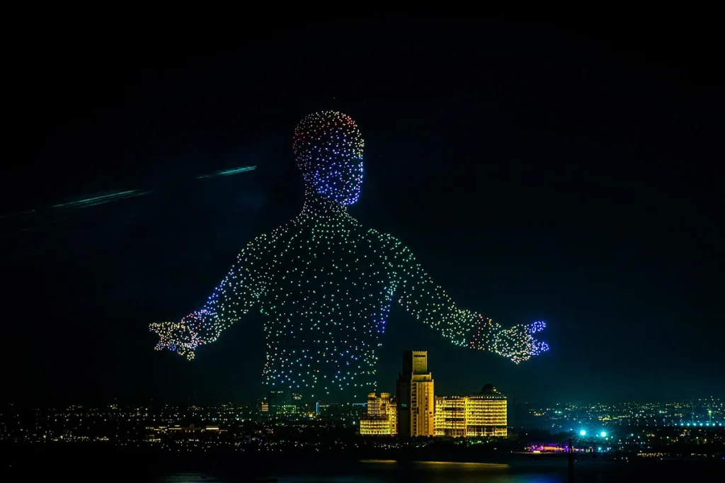1.000 pyro uçağı da dahil olmak üzere toplam 2.300 drone, phoenix’in yenilenmeyi, iyimserliği ve yeniden doğuşu simgelemesiyle gece gökyüzünü dinamik bir tuvale dönüştürdü. Drone performansını, kıyı şeridi boyunca renk ve ışık dalgaları dalgalanırken Marjan Adası’ndan Al Hamra’ya altı kilometre uzanan kesin olarak zamanlanmış bir havai fişek geri sayımı izledi.