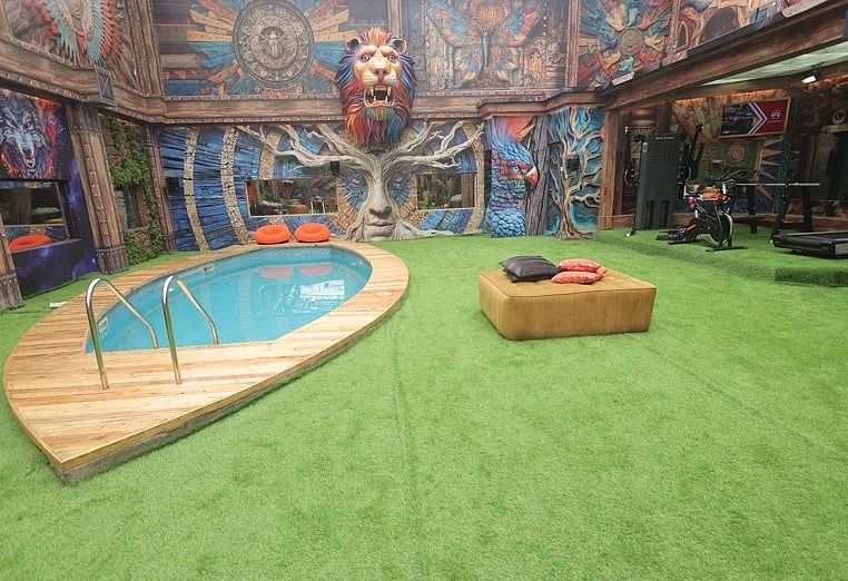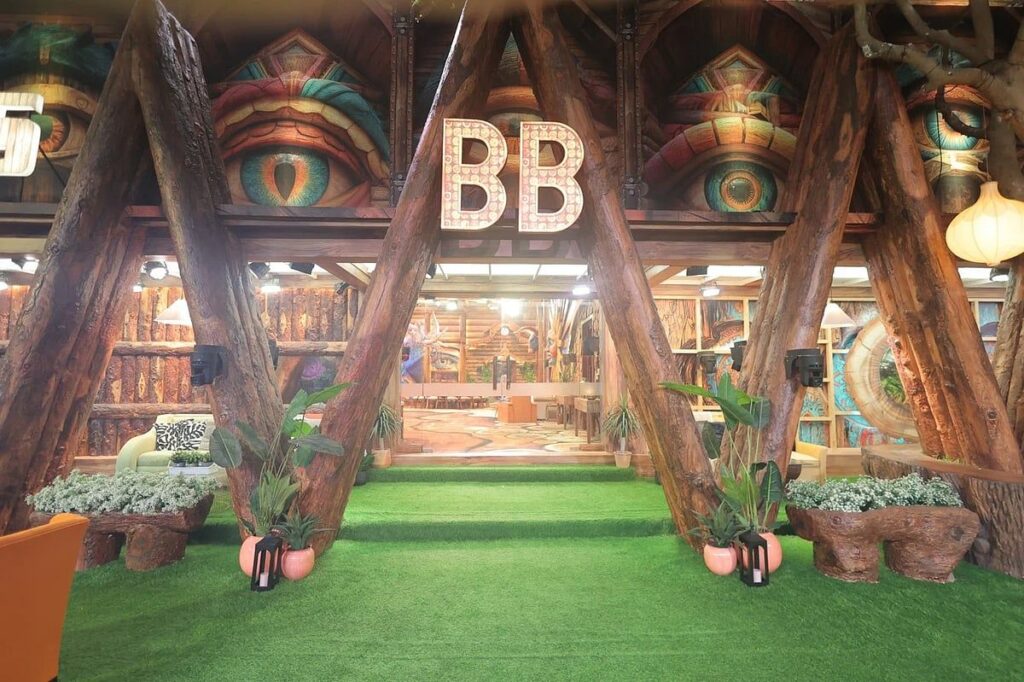 Bigg Boss’un oturma odasındaki giriş, gösterinin katılımcı yarışmacıları için doğal bir manzara özü veren W şeklinde ahşap bir sütun ile işaretlenmiştir.