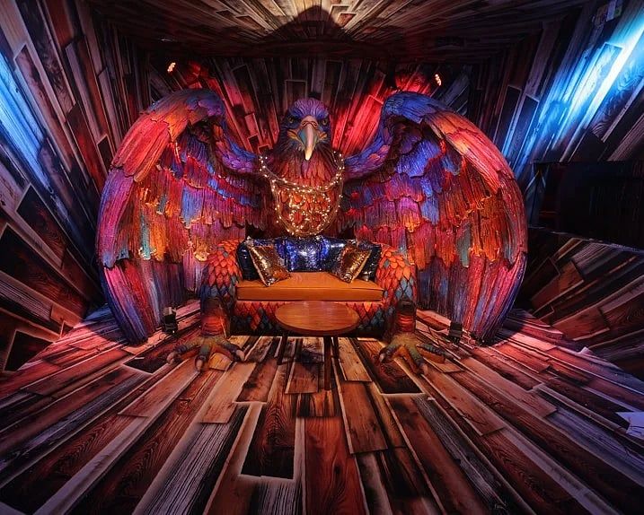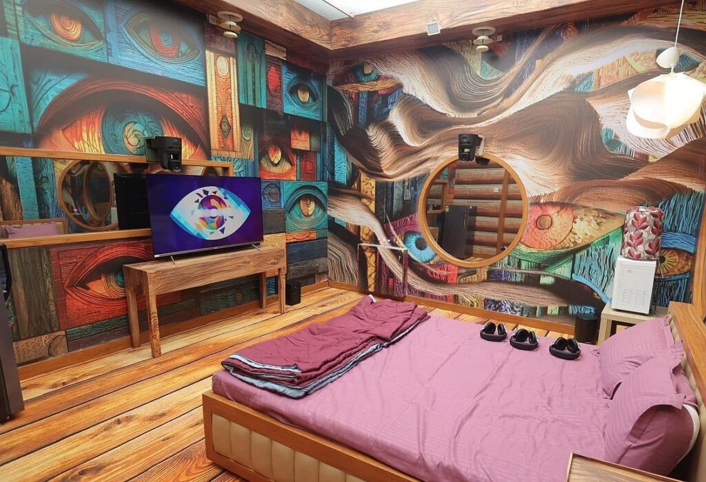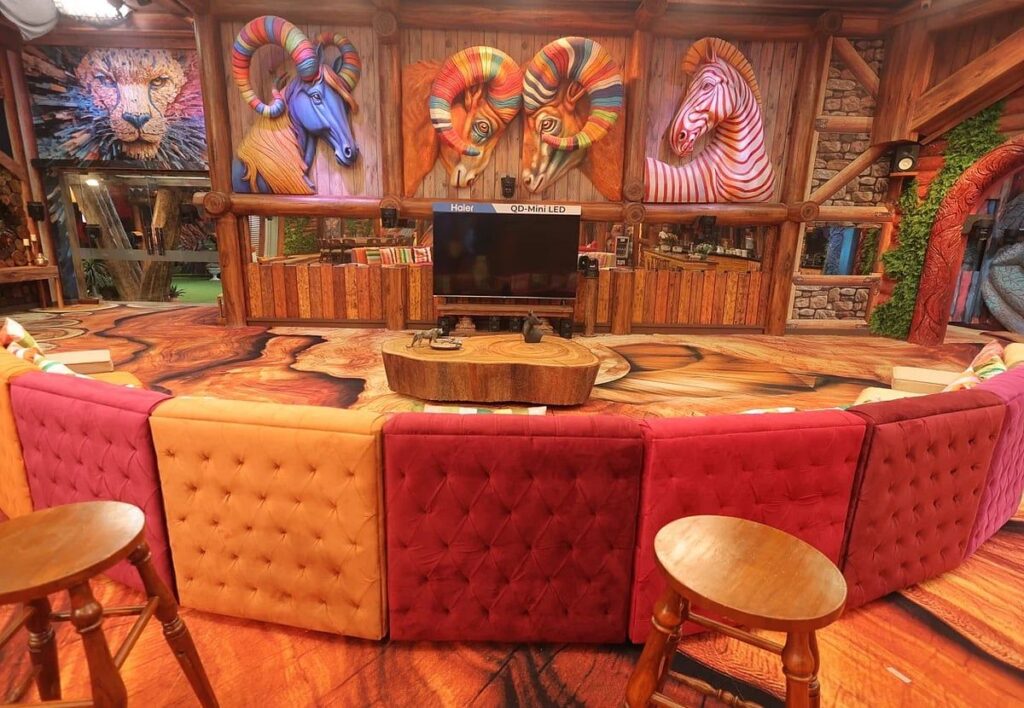 Oturma odasındaki geyik ve aslanın duvar çizimleri, tipik olarak o bölgede meydana gelen günlük kavgaların sembolik bir temsili gibi görünüyor. Salman Khan’ın ‘Hafta Sonu Ka Savaşı’, ev sahiplerinin bir televizyon aracılığıyla ev arkadaşlarıyla etkileşime girdiği oturma odasında da geçiyor.