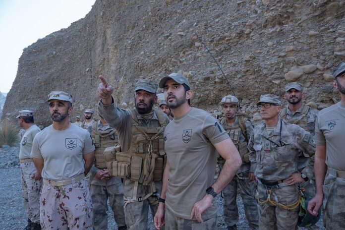 Dubai Veliaht Prensi askerlerle birlikte dağlara tırmandı, zipline edildi ve aynı zamanda liderliğinin ve silahlı kuvvetlere olan yakınlığının bir göstergesi olan bir atış tatbikatı yaptı.