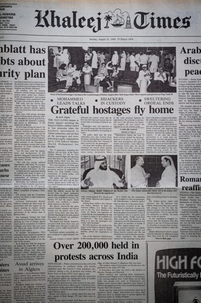 Kırk yıl önce, 25 Ağustos 1984’te, tüm dünya Dubai Uluslararası Havaalanı’nda (DXB), yedi Halistan yanlısı isyancı tarafından kaçırılan Indian Airlines Flight 421’i içeren gergin bir rehine draması izliyordu.Khaleej Times’ın bildirdiği gibi, Hintli uçak gemisi Delhi-Palam Havalimanı’ndan Chandigarh üzerinden Srinagar Havalimanı’na iç hat uçuşundaydı ve gemide beş çocuk ve altı mürettebat üyesi olmak üzere 73 kişi vardı.En son haberlerden haberdar olun. WhatsApp Kanallarında kt’yi takip edin.Ancak dengesiz hava koşulları nedeniyle uçak Karaçi’ye yönlendirildi ve ardından Dubai’ye yöneldi. BAE yetkilileri başlangıçta iniş iznini reddetti. DXB, sabah 3’ten (25 Ağustos 1984) bir buçuk saat kapatıldı ve altı uçuş başka yerlere yönlendirildi.Khaleej Times ‘K.P. Nayar, Hint uçağının yaklaşık iki saat boyunca tepeden döndüğünü bildirdi. Sabah 4.30’da çılgın bir kaptan kontrol kulesine çok az yakıtı olduğunu bildirdi ve suya iniş yapacağı konusunda uyardı.Dönemin Dubai Polisi komutanı Albay Dahi Khalfan Tamim, yerel makamların da uçağın yakıt konumu konusunda endişeli olduğunu ve yolculara duydukları endişeden dolayı sabah 5’ten kısa bir süre sonra inmesine izin verdiğini söyledi.”İnişten bir saat sonra uçak, havaalanı hakkında bilgi almak için kontrol kulesiyle temasa geçti. Bu sırada Hindistan Büyükelçisi İshrat Aziz, başkonsolos P.L. Goyal ve diğer Hintli diplomatlar havaalanına koştu. Ardından Bükreş’ten Doha’ya giden Hindistan Dışişleri Bakanı A.A. Rahim, istişarelere hazır olması için Katar gezisini erteledi.