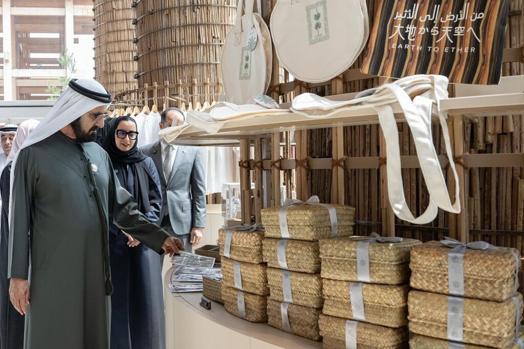 “Palmiye ağacından ilham alan ulusal pavyonumuzun tasarımını beğendim… Şeyh Muhammed bir sosyal medya gönderisinde, palmiye yapraklarından ve gövdelerinden inşa edilen eski evler olan yeni bir “ariş” konseptine dayanıyor ” dedi.