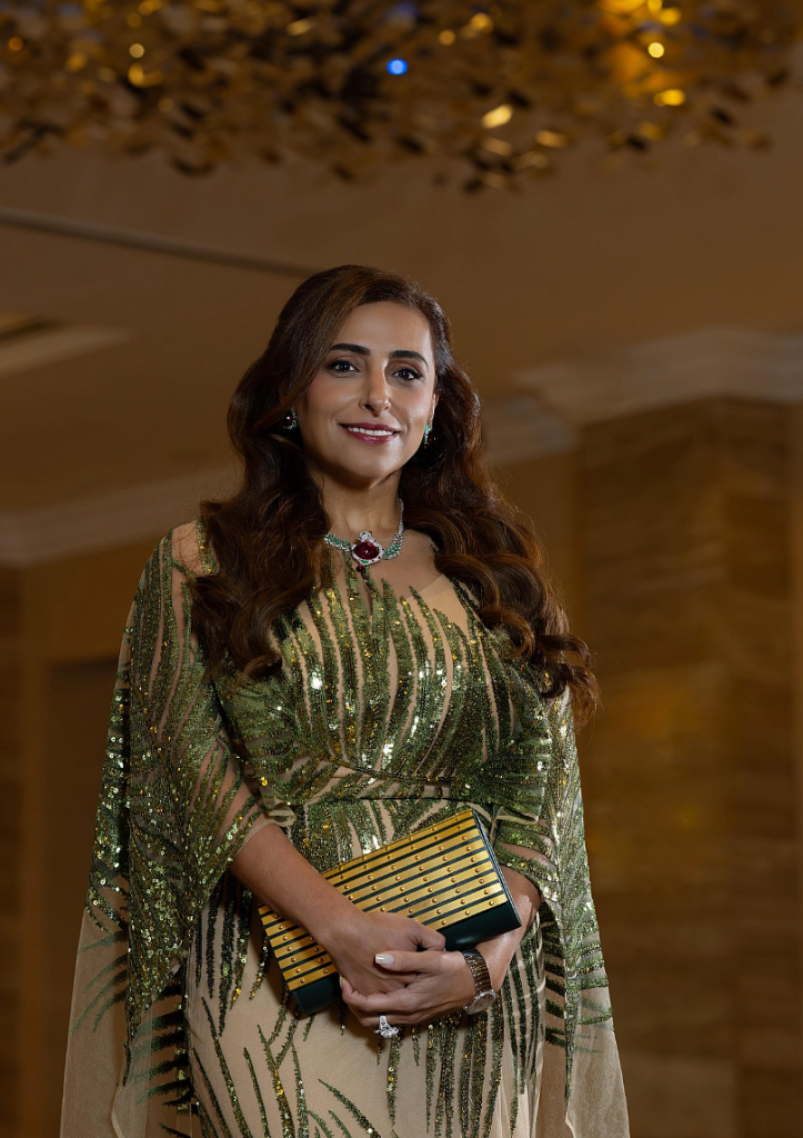 Sharjah Hükümdarının kızı, kıyafetine Cartier’in göz kamaştırıcı mücevherleriyle aksesuar taktı. Kolyede, pırıl pırıl pırlantalarla çevrili, yakutun üzerine nazikçe yerleştirilmiş, markanın ikonik panteri yer alıyordu. Benzer bir yüzük ve küpelerle eşleştirildi.
