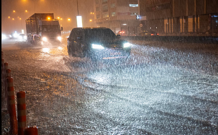 Arabalar sağanaktan temkinli bir şekilde geçerken şiddetli sağanaklar sokaklara çarpıyor, yağmur suyu hızla birikiyor, yollar su basıyor ve sürücüler su birikintilerinde ve su basmış yerlerde geziniyor.