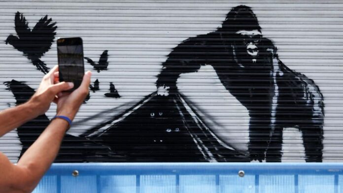 Salı günü sokak sanatçısı Banksy, Londra’daki hayvan temalı sanat yolunun dokuzuncu ve belki de son duvar resmini, başkentin hayvanat bahçesinin kepenklerinde bir deniz aslanını ve kuşları serbest bırakan bir gorili gösteren bir resimle iddia etti.
