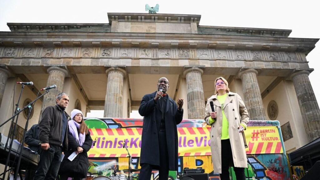 Berlin Eyaleti Kültür ve Sosyal Uyum Senatörü Joe Chialo, sanatçılar ve kültür çalışanları Çarşamba günü Berlin’deki Brandenburg Kapısı önünde kültür sektöründeki bütçe kesintilerini protesto etmek için bir mitinge katılırken sahnede konuşuyor. reutersMitinge konuşan Berlin kültür bakanı Joe Chialo, kültür sektörünü Berlin’in “ağır sanayisi” olarak nitelendirdi ancak bütçeyi dengelemek için kesintilerin gerekli olduğunu söyledi.Muhafazakar CDU partisi bakanının konuşması kalabalıktan bir yuhalama ile karşılandı.Chialo, tasarrufların departmanlar arasında “adil bir şekilde dağıtılması” gerektiğini, ancak kesintilerin “herkes için yönetilebilir” olmasını istediğini söyledi.