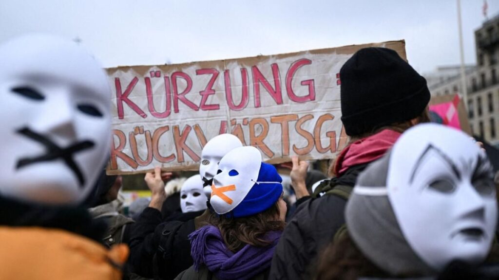 Sanatçılar ve kültür çalışanları, Çarşamba günü Berlin’deki Brandenburg Kapısı önünde kültür sektöründeki bütçe kesintilerini protesto etmek için düzenlenen mitinge katılırken maske takıyorlar. reuters