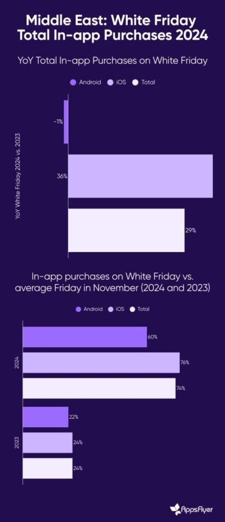Verilere göre, 2024 Beyaz Cuma günü akıllı telefon uygulama içi satın alımları, Kasım ayındaki ortalama Cuma günlerine göre% 74 artarak 2023’teki% 24’ten keskin bir artış gösterdi.Pazarlama ölçümü, ilişkilendirme ve veri analitiğinde dünya lideri olan AppsFlyer, Orta Doğu’daki mobil ticaret faaliyetlerinde önemli bir büyüme sergileyen Beyaz Cuma 2024 öngörülerini yayınladı.Yıldan yıla, Beyaz Cuma alımları, iOS’ta% 36’lık bir artış ve Android’de neredeyse düz performansın (yıllık bazda% -1değişiklik) etkisiyle% 29 arttı.Veriler, White Friday’in mobil ticaret için, özellikle de etkinliğin önemli metrikler arasında yükseldiği iOS kullanıcıları için kilit bir olay olarak artan öneminin altını çiziyor.Orta Doğu’daki şirketler, tüketicilerin uygulamalarını indirmeleri ve uygulamalarıyla etkileşimde bulunmaları için rekabet ettikçe, araştırmalar Beyaz Cuma gibi etkinliklerin kaçırılmayacak bir fırsat olduğunu gösteriyor. Bu yıl, Beyaz Cuma sırasında, e-ticaret ve perakende uygulamaları Kasım ayındaki ortalama Cuma günlerine göre% 29 artış göstererek geçen yıla göre önemli bir artışa işaret etti (% 19).Bu eğilim, hedefli pazarlama kampanyalarının yönlendirdiği organik olmayan kurulumlara (NOI’LER) de yansımıştır. Noı’ler Beyaz Cuma günü Kasım ayındaki ortalama Cuma günlerine göre% 30 arttı. Ancak, yıllık bazda, yalnızca bu Cuma günü incelendiğinde NOI’LER% 37 düştü.Orta Doğu’daki mobil pazarlamacılar için de dikkat çekici olan yeniden pazarlama dönüşümleri yıllık% 81 artarken, iOS 2023 Beyaz Cuma’ya kıyasla% 123 değer artışıyla ön plana çıktı.