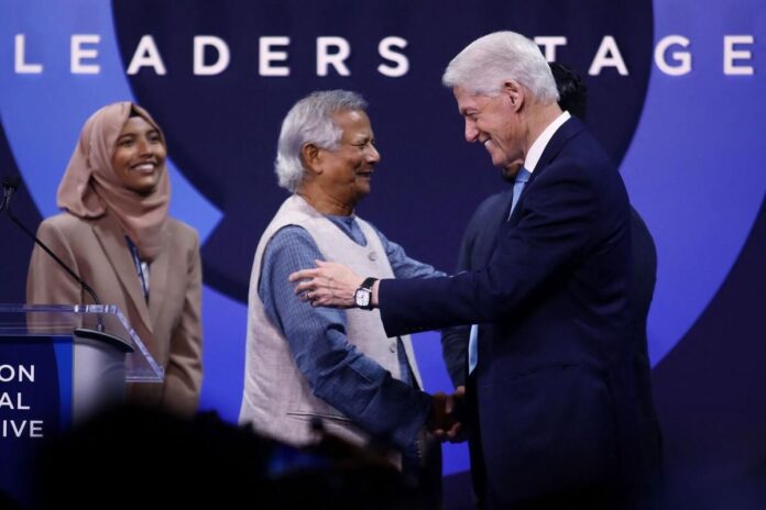 Nobel Barış Ödülü sahibi Yunus, daha sonra 40 yıllık dostluklarını ve Bangladeş’in öncü mikrofinans kredilerinin küresel etkisini selamlayan eski başkan Bill Clinton’dan büyük övgü aldı.