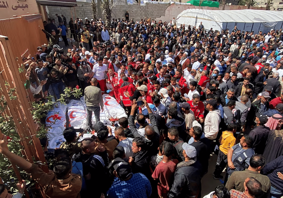 23 Mart’ta Refah yakınlarında 15 sağlık görevlisi ve acil müdahale ekibi vurularak öldürüldü ve sığ bir mezara gömüldü. Cesetleri sadece bir hafta sonra Filistinli Kızılay ve Birleşmiş Milletler yetkilileri tarafından bulundu.