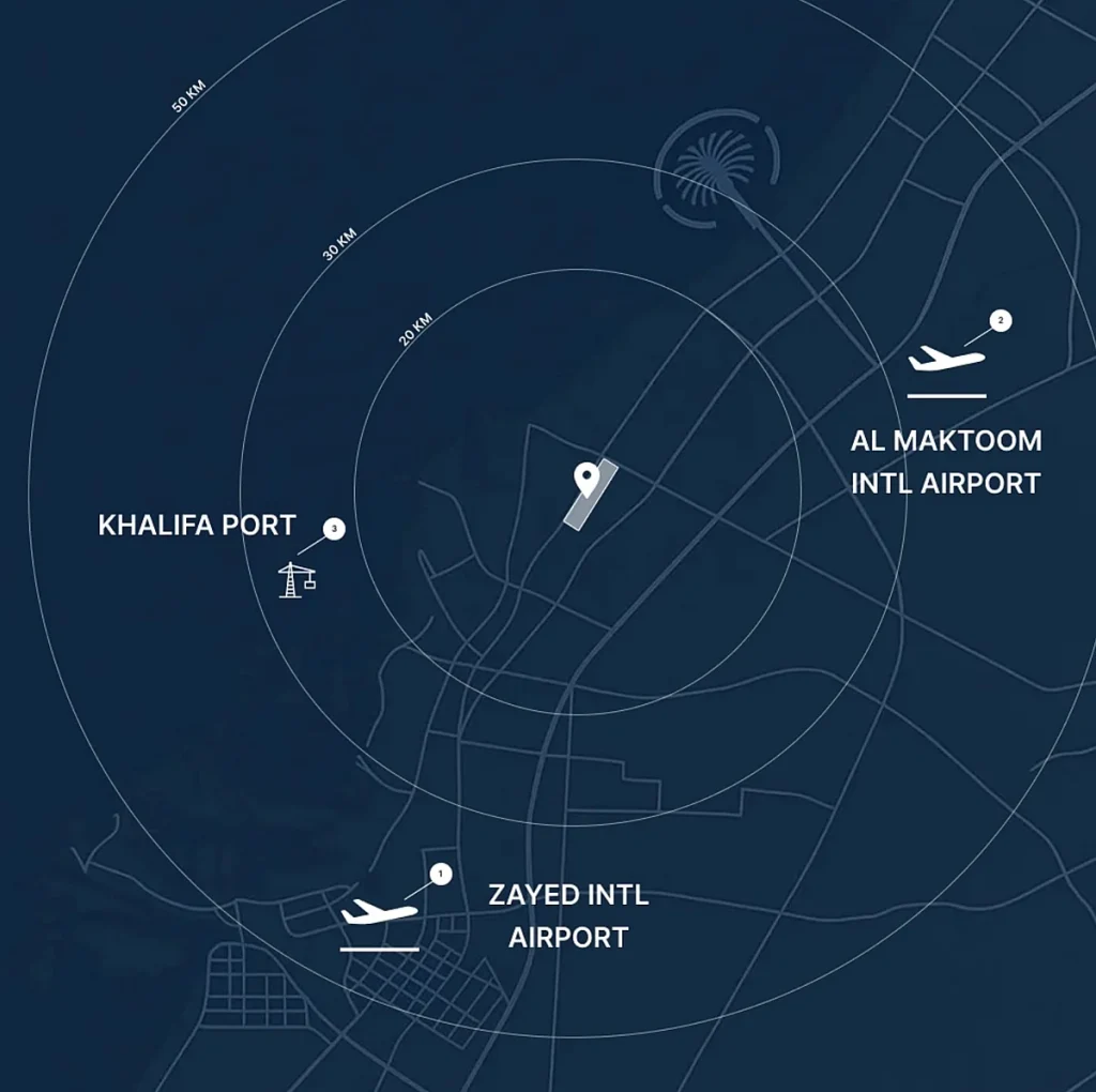 Seyahat kolaylığı için topluluğun hem Al Maktoum Uluslararası Havaalanı hem de Zayed Uluslararası Havaalanı 50 km’lik bir yarıçap içinde.