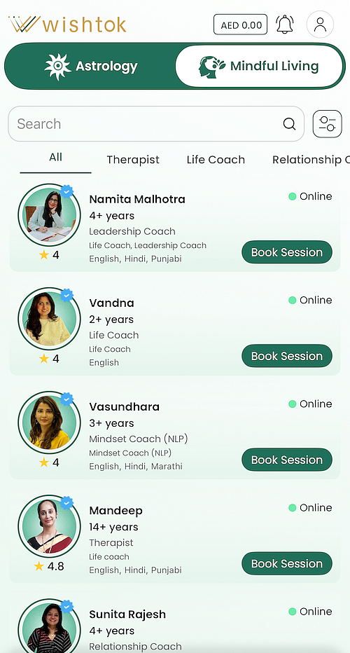 Uzmanlarla bağlantı kurmak için gerekeni yaptım – söz konusu uygulamayı indirin, bir profil oluşturun, Mindful Living etiketli bir sekmeye gidin ve ihtiyacınız olan koç türünü seçin ve seçeneklerle sunulduğunda size en uygun kişiyi seçin. Seçenekler listesi size ne tür bir profesyonel olduklarına, konuştukları dillere, kaç yıldır çalıştıklarına, incelemelere ve onlar hakkında biraz bilgi verir.