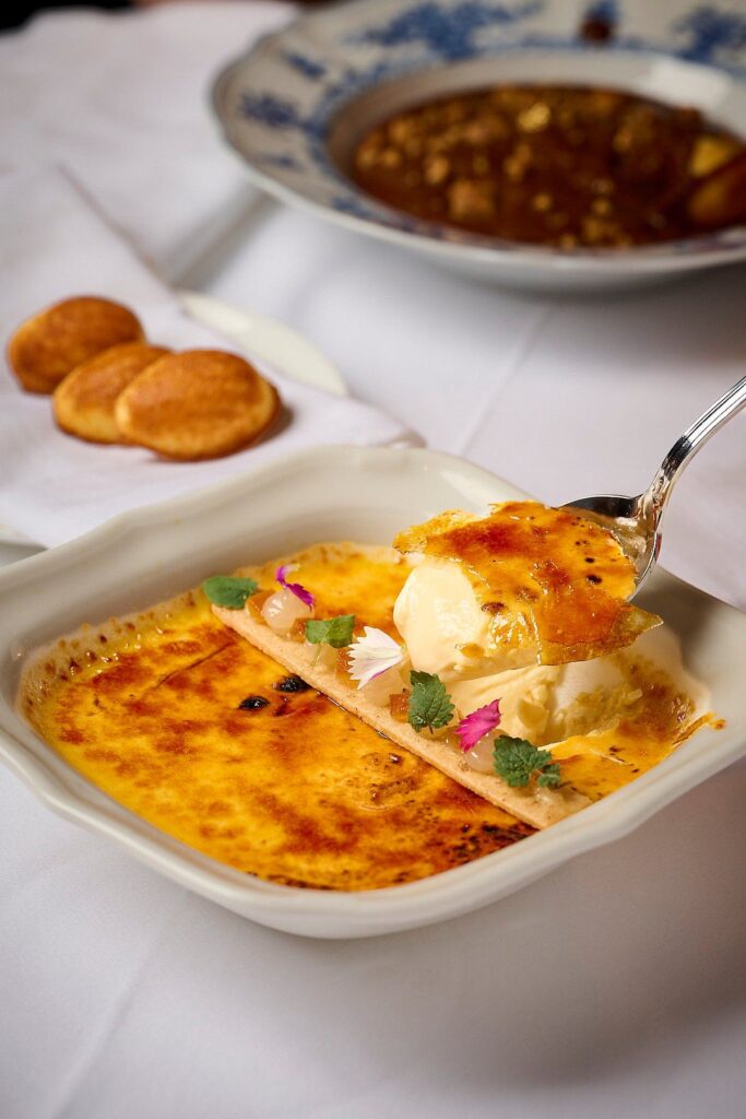 Yemeği klasik bir Crème Brulée ile bitirdik — altın, karamelize bir üst, aşağıda ipekli muhallebiyi ortaya çıkarmak için bir rüya gibi çatladı. Basit ama tatmin edici bir final.