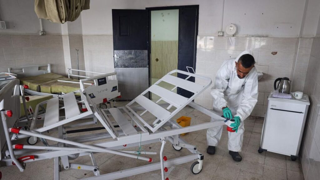 Filistinliler, Han Younis’teki harap Nasır Hastanesini rehabilite etmek için çalışıyorlar. — Fotoğraf: AFPHava saldırıları, bombardıman ve çatışmalar Gazze’nin diğer bölgelerini sarsmaya devam ederken, Nasır’da yataklar düzleştirildi, enkaz temizlendi ve Sınır Tanımayan Doktorlar (MSF) logolarını taşıyan beyaz önlükler yerel sağlık görevlilerinin mavi üniformalarıyla karıştı.Uluslararası STK, güney Gazze Şeridi’ndeki en önemli hastane olan hastanede çalışmaya yeni başladı.Ebu Ahmed, “Tanrıya şükür MSF, Nasır Hastanesi’nde tekrar çalışmaya başlayabildi ve tedavi için geri döndüm” dedi.Gazze’deki bölgenin en büyük hastanesinden biri olan “Durumum düzeldi, ancak El Şifa Hastanesi’nde olanların tekrarlanacağından korkarak biraz zaman geçirdim” dedi.