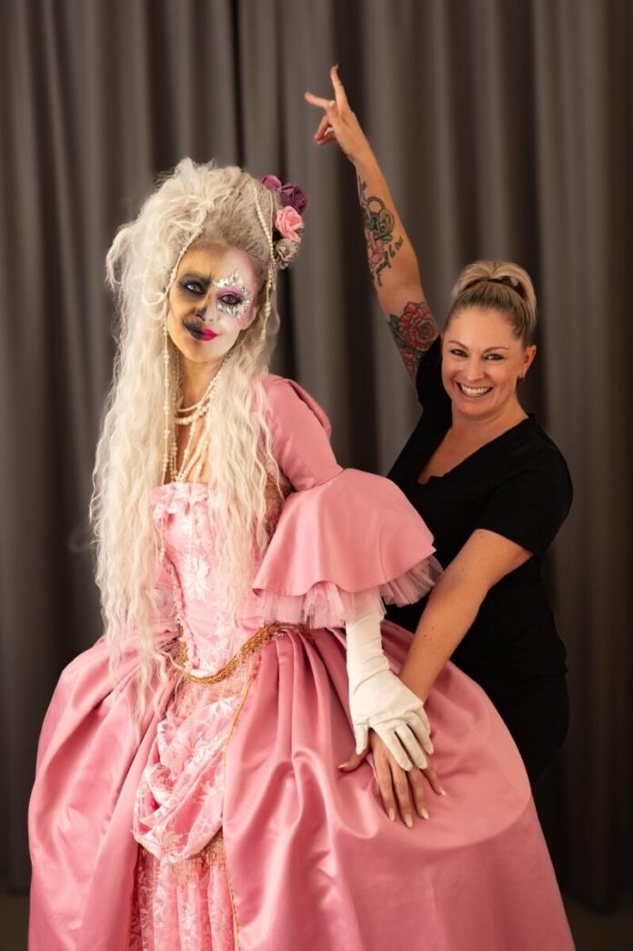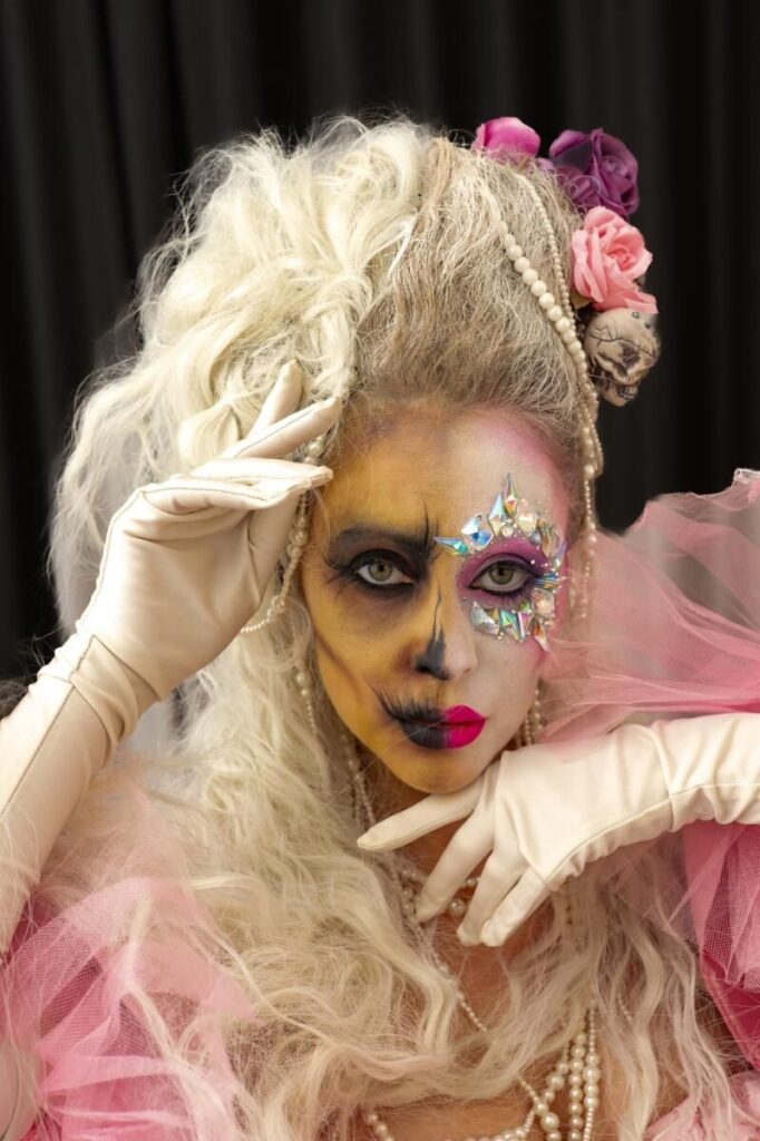 • Her iki göze de rimel sürün.* Kirpik tutkalı ve cımbız kullanarak Barok gözün etrafına irili ufaklı kristaller sürün, kristaller arasındaki boşlukları kirpik tutkalı ve gümüş parıltıyla doldurun.Dudaklarınızın Barok tarafına pembe ruj sürün.* Makyajınızı sabitleme spreyi ile sabitleyin, böylece daha uzun süre açık kalır.Saç stilini doğru yapın* Saçınızın ön kısmını ayırın ve birkaç saç tutacağı kullanarak başınızın üstüne büyük bir saç çöreği uygulayın* Saç çöreğini çevreleyen saçın tüm bölümlerini taraklayın ve saç spreyi sıkın.* Geri taranan her bölümü saç çöreğine sabitleyin.• Tamamen dışarı çıkmak istiyorsanız, saç çöreğine bir peruk takın ve bölümlerini kafanıza takın.* Saçı beyaz ve tozlu yapmak için kuru şampuan kullanın.* Peruğu inciler, çiçekler ve Cadılar Bayramı ile süsleyerek bitirin.