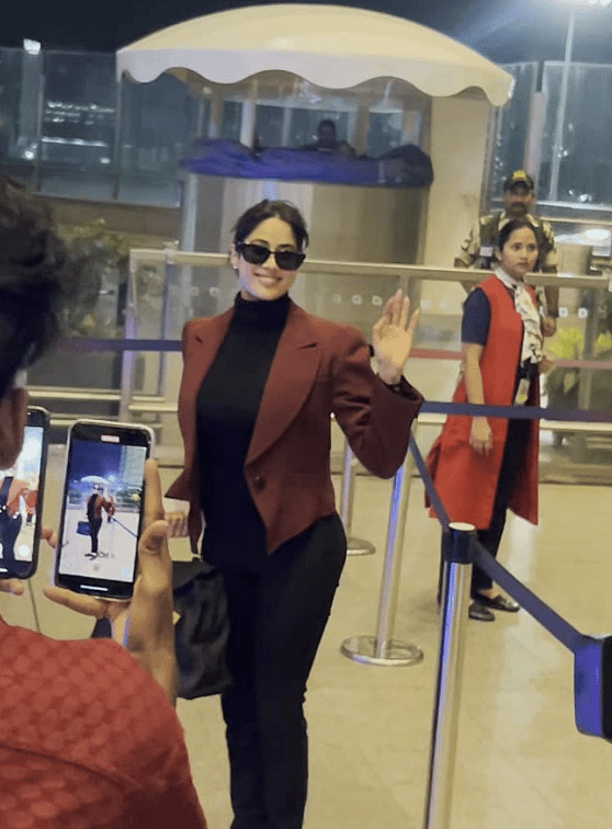 Havaalanı görünümünü bordo bir ceket, şık siyah güneş gözlüğü ve kıyafetine bir dokunuş katan şık bir çanta ile tamamladı.