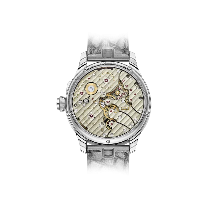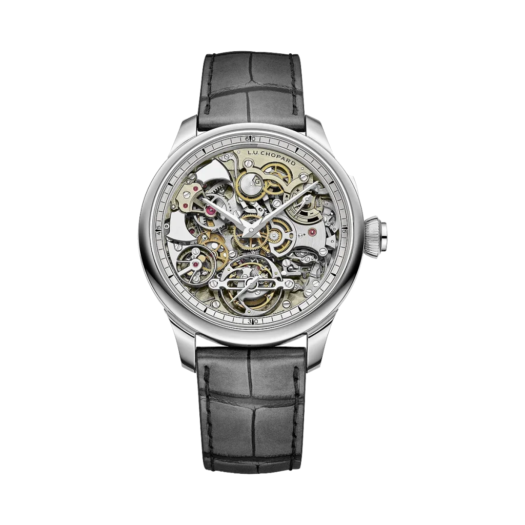 Bu saatin tiyatrosu, onu gördüğünüz anda başlar. Etik beyaz altından oyulmuş 43 mm’lik kasa, koruduğu olağanüstü karmaşıklığı reddediyor. Chopard kadranı tamamen çıkardı ve perdeyi, her biri safirin altında görülebilen 686 bileşenden yapılmış, elle sarılmış L.U.C 08.03-L – a kalibresine geri çekti. Bu tasarım seçimi, ses mekanizmasına adım atmak için bir davettir.
