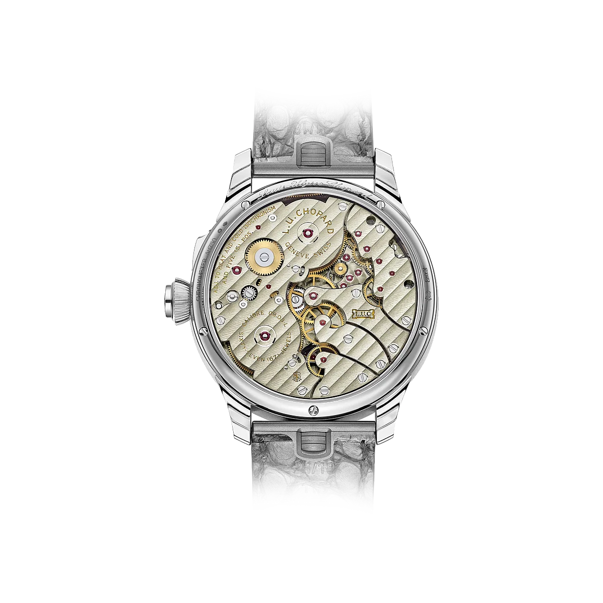 Saat 10’da, bir çift pırıl pırıl çelik çekiç onların işaretine hazır oturuyor. Seçicinin tacın yanına hafifçe kaydırılmasıyla, kullanıcı, her biri Chopard’ın kendi safir kristal gonglarıyla ifade edilen grande sonnerie, petite sonnerie veya sessizlik arasında hareket edebilir. Tonlarının saflığı tesadüf değildir – sesin sadece etrafında değil, bir saat aracılığıyla nasıl rezonansa girmesi gerektiğine hakim olmak için harcanan yıllardan gelir.