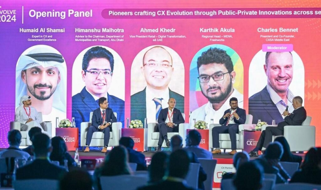 Soldan: CX ve Hükümet Mükemmelliği Uzmanı Humaid Hassan Salem Alshamsi; Abu Dabi Belediyeler ve Ulaştırma Bakanlığı Başkan Danışmanı Himanshu Malhotra; E& BAE Perakende – Dijital Dönüşüm Başkan Yardımcısı Ahmed Khedr; Freshworks Bölge Müdürü Karthik Akula; ve Açılış panelinde CXSA Middle East’in Başkanı ve Kurucu Ortağı Moderatör Charles Bennet, ' Sektörler Arası Kamu-Özel Sektör Yenilikleriyle CX Evrimi Yaratmanın Öncüleri'