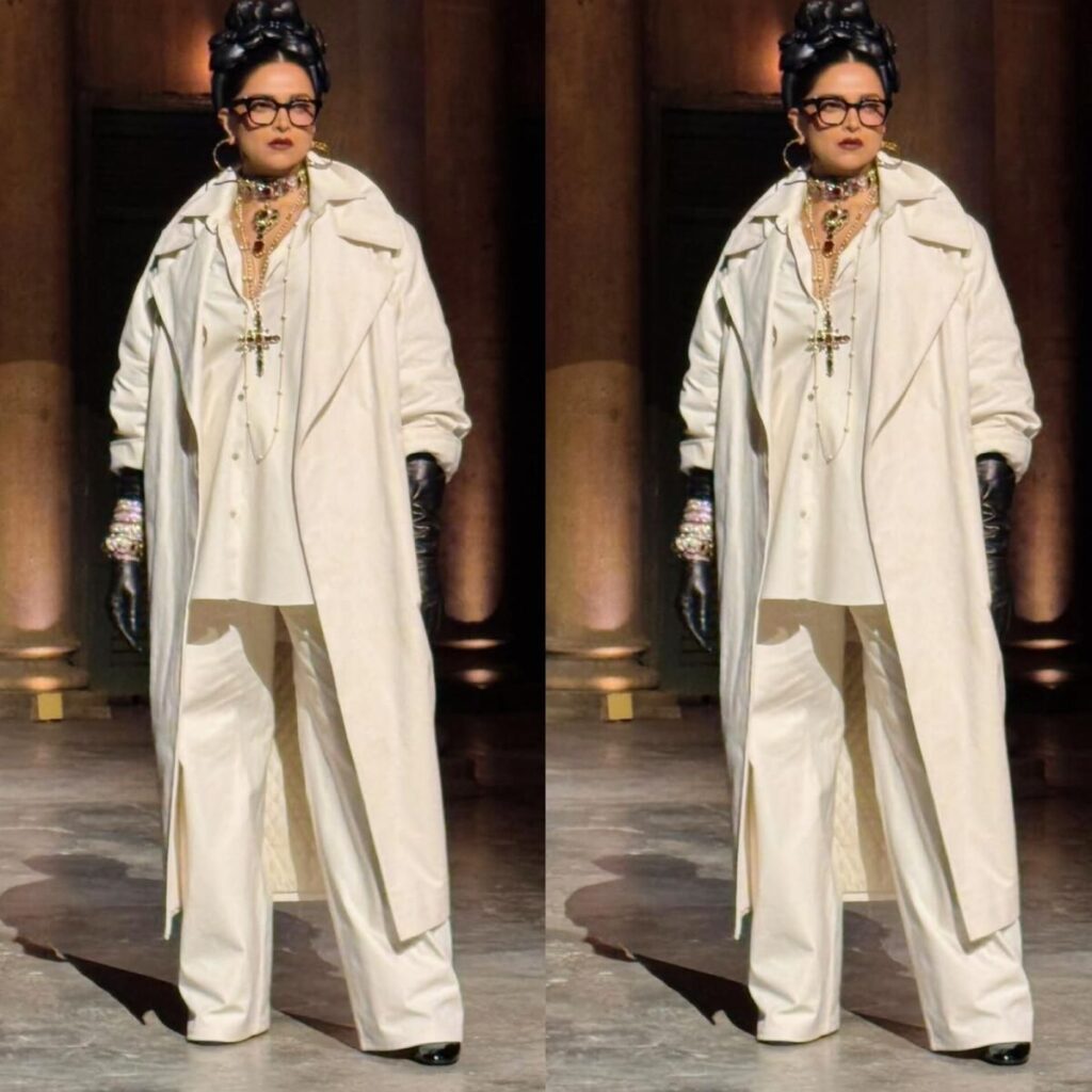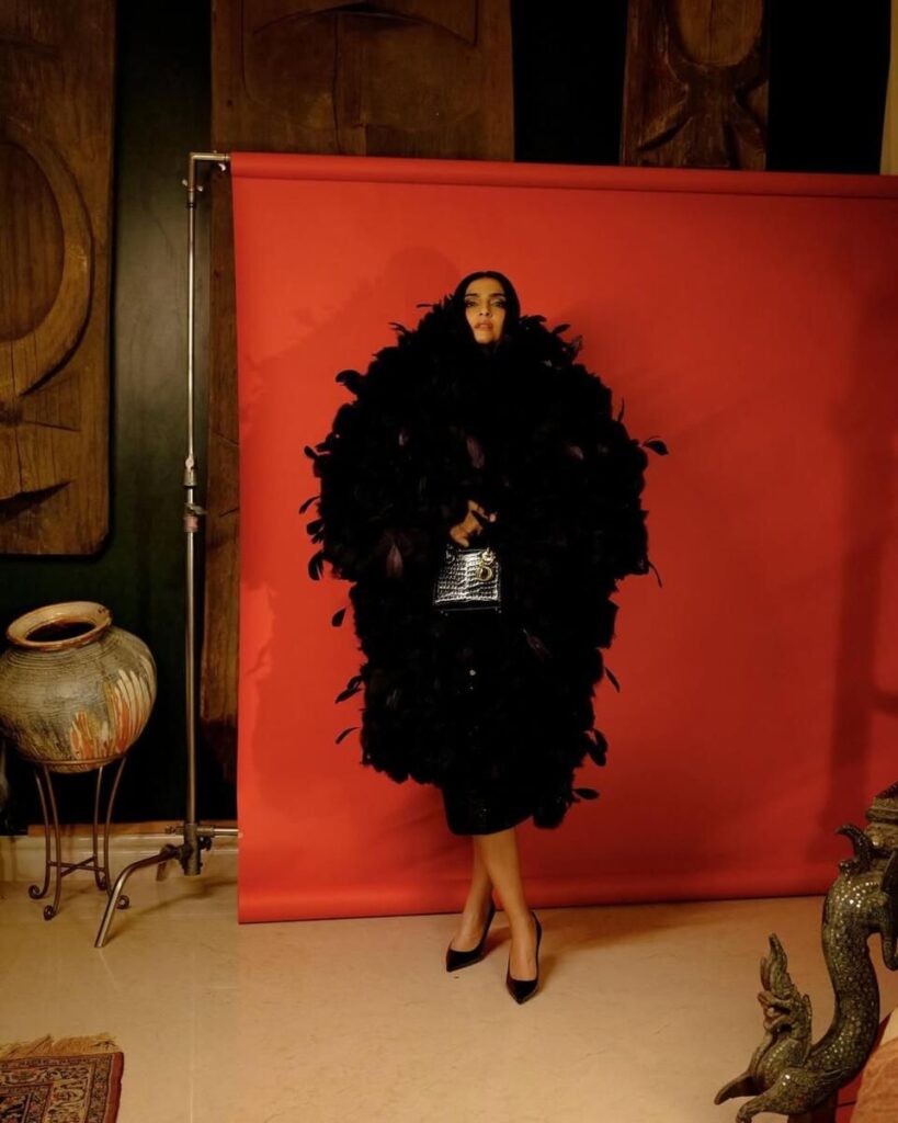 Rhea Kapoor tarafından tasarlanan Sonam Kapoor, Sabyasachi 2024 couture’da ipek bluz, kalem etek, tüylerle süslenmiş kaban ve elmas gerdanlık, miras küpeleri ve siyah pompalarla süslenmiş siyah Lady Dior çantasıyla göz kamaştırdı.Aditi Rao Hydari