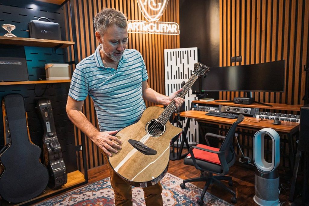 Şimdi bu özlü soru için: sedef işlemeli, altın pullarla süslenmiş veya nadir Alaska Sitka ladin ağacından oyulmuş pahalı gitarlar normal olanlardan daha mı iyi geliyor? “Bazı insanlar, ‘Ah, belirli bir fiyatı geçtiğinizde, asla bir fark duymazsınız. Vlemmiks, “Buna tamamen katılmıyorum” dedi.Şöyle açıkladı: “Orada mutlu bir şekilde çalabileceğim ve gerçekten iyi ses çıkarabileceğim 5.000 Dh’ye ait gitarlarım var. Biri gelip bana bütçemin 5.000 Dh olduğunu söylerse ve en iyi çalan gitarı istersem, [o zaman] onlara [bütçe dahilinde] en iyi çalan gitarı bulacağım. Ama eğer söylerlerse, sadece en iyi ses gitarını istiyorum ve paranın seçeneği yok, o zaman onlara Eğik gitarı göstereceğim.”