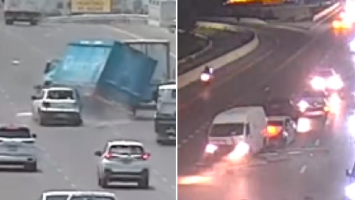 Cuma günü bir polis videosunun gösterdiği gibi, Abu Dabi’deki iki sürücü beklenmedik tehlikeler nedeniyle aniden yolda durduktan sonra ciddi kazalara neden oldu.
