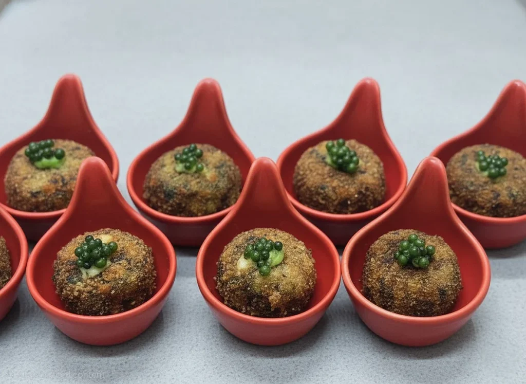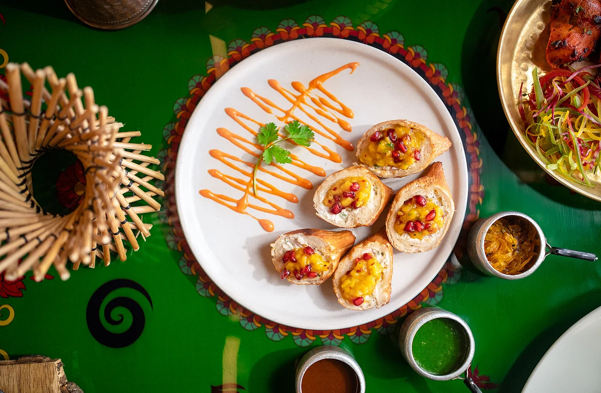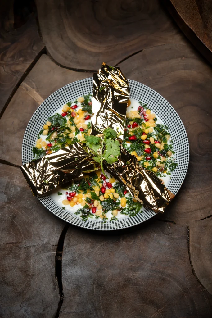 Üzerine kızarmış köri yaprakları, boondi ve kavrulmuş kimyon tozu serpin. Bu elemanlar, net doku ve dumanlı derinlik katmanları getirir. Otsu bir kaldırma için nane tozu ile hafifçe tozlayın.