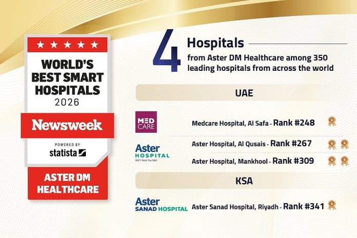 Kik’in önde gelen entegre sağlık hizmeti sağlayıcılarından biri olan Aster DM Healthcare, 350 küresel hastaneden oluşan prestijli Dünyanın En İyi Akıllı Hastaneleri 2026 listesinde yer alan dört hastanesi ile bir kez daha uluslararası tanınırlık kazandı. statista ile oluşturulan Newsweek sıralaması, sağlık profesyonellerinin küresel anketlerine ve hastanelerin ileri tıbbi teknolojileri benimseme değerlendirmelerine dayanmaktadır.