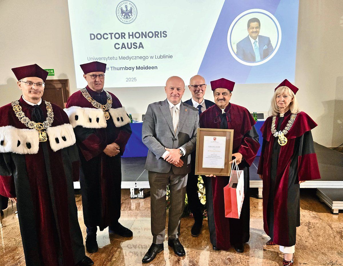 Muazzam bir gurur ve küresel tanınma anında, Thumbay Group’un kurucusu ve başkanı Dr. Thumbay Moideen, bu kez Polonya’nın prestijli Lublin Üniversitesi tarafından beşinci onursal doktorasını aldı. Bu övgü, küresel sağlık hizmetlerine, tıp eğitimine ve toplum gelişimine yönelik araştırmalara yaptığı eşsiz katkıları bir kez daha teyit ediyor.