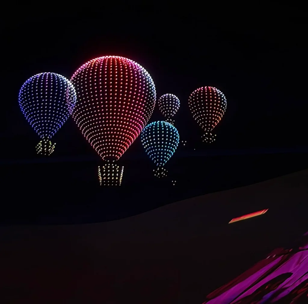 Kum tepelerinin üzerinde, yüzlerce dron uçtu ve yaklaşık 16 dakika süren bir gösteri sırasında gece gökyüzünde art arda ışık desenleri ve semboller oluşturdu. Havai fişekler izledi, çöl zeminini aydınlattı ve çoğu sezon için kurulan kamplarla çevrili kumun karşısında oturan seyircilerden alkış aldı.